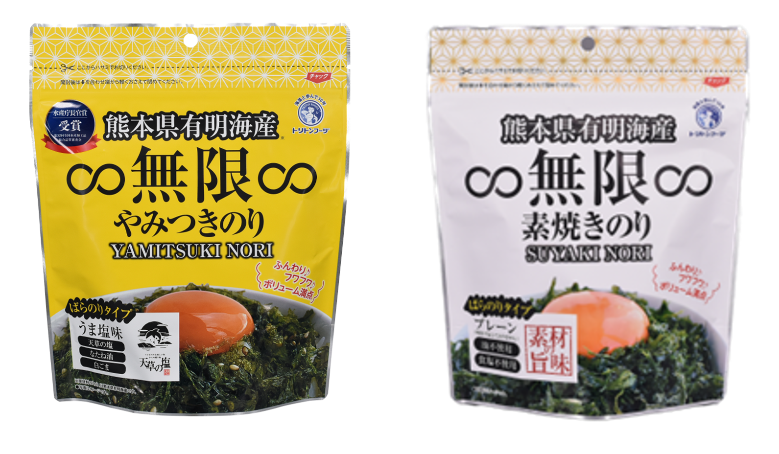 この度、株式会社トリトンフーヅ(本社:熊本県宇土市城塚町169-1、代表取締役社長:髙木 良樹)は、2021年の発売から好評いただいている、うま塩味のばらのり「∞無限∞やみつきのり」と、姉妹品でプレーンタイプの「∞無限∞素焼きのり」について、原料である有明海苔の不作による価格高騰に対し、当面の間、価格据え置きで販売することに至りました。