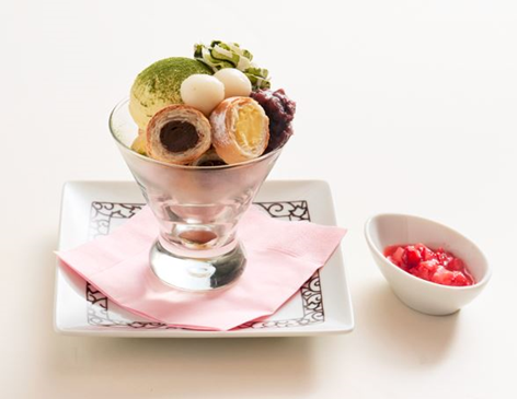 濃厚なバニラアイスに香り高い宇治抹茶パウダーとソースをかけて、十勝小倉と白玉をトッピング♪