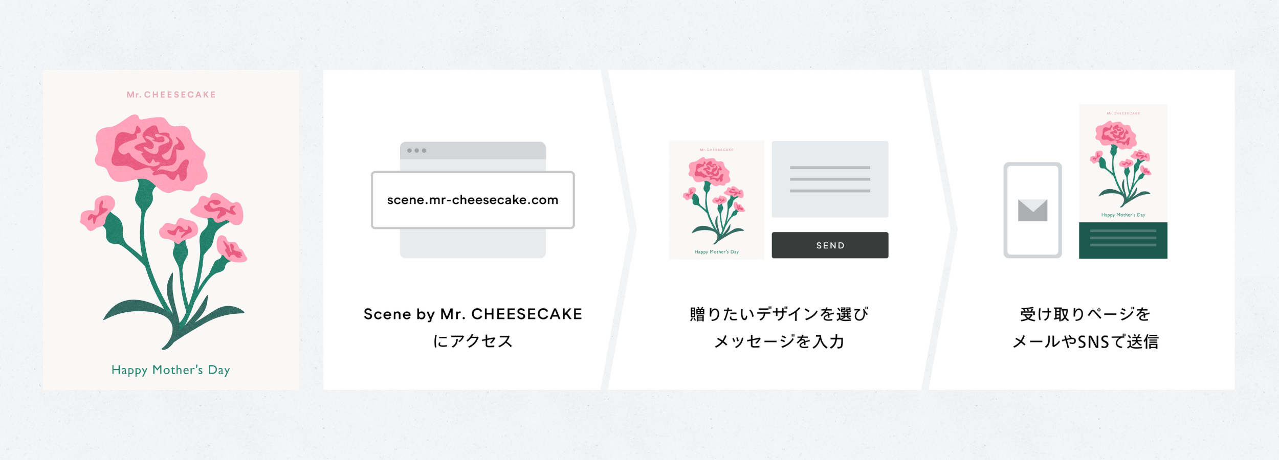 そして、大切な人にオリジナルのデジタルグリーティングカードが贈れる「Scene by Mr. CHEESECAKE」からは母の日限定デザインが登場します。普段なかなか伝えることのできないお母さんへの感謝を、贈り物にのせて伝えてみてはいかがでしょうか。