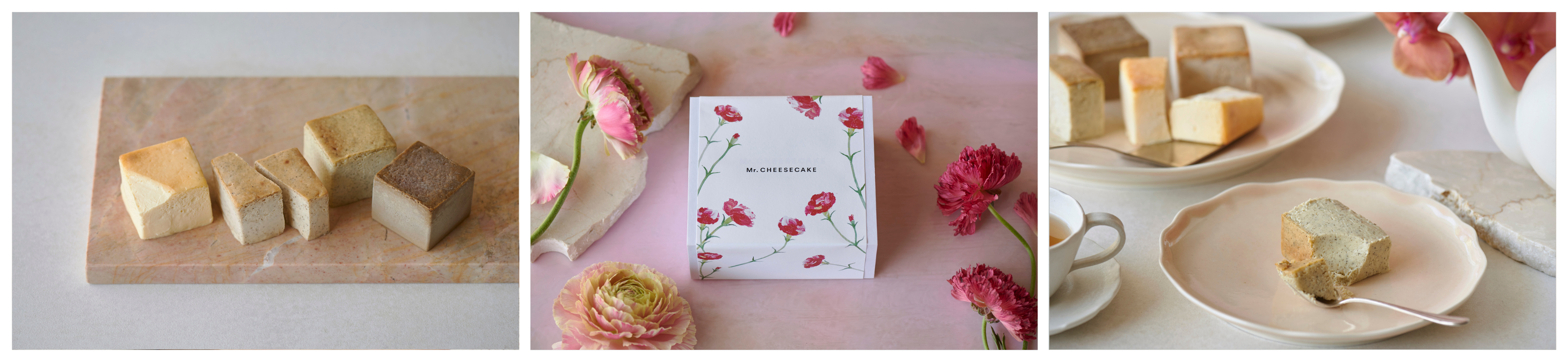 Mr. CHEESECAKE 通常フレーバーと、香ばしさとこっくりとした旨味の「Mr. CHEESECAKE Hojicha」、軽やかで酸味のある「Mr. CHEESECAKE Tohobijin」、甘く優雅な香りと心地よい渋みの「Mr. CHEESECAKE Jasmine」を一度に楽しめるアソートセット。大切な人とひと口ずつシェアできるキューブ型のケーキ4種をオリジナルのBoxに詰め、カーネーションのイラストが描かれた包装紙を巻いてお届けします。
