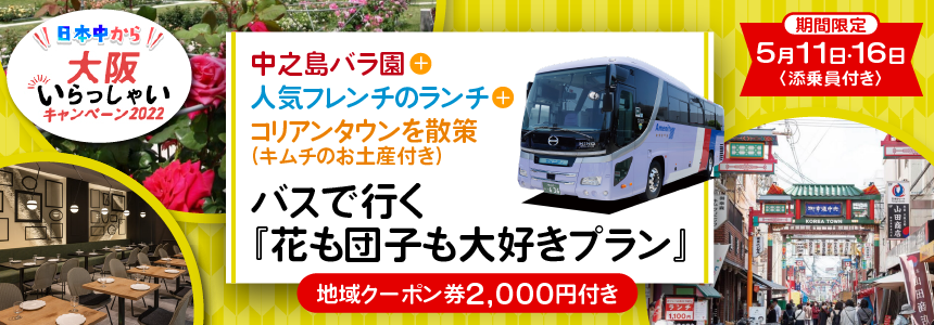 【5月11日(木)・5月16日(月)大阪出発】《全国旅行支援》〈添乗員付き〉中之島バラ園+人気フレンチのランチ+コリアンタウンを散策(キムチのお土産付き) バスで行く『花も団子も大好きプラン』