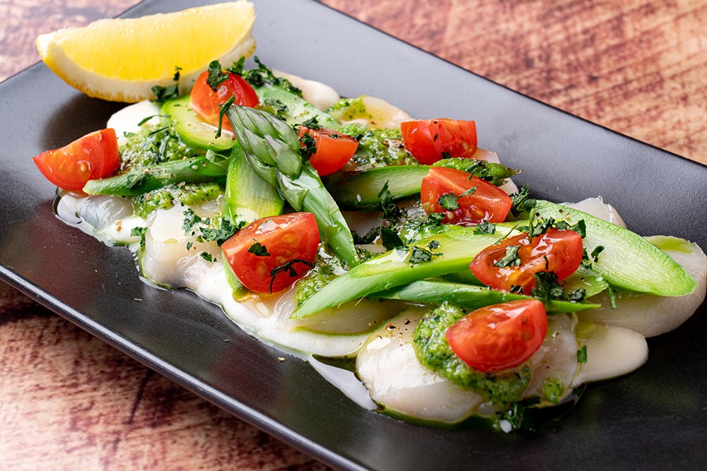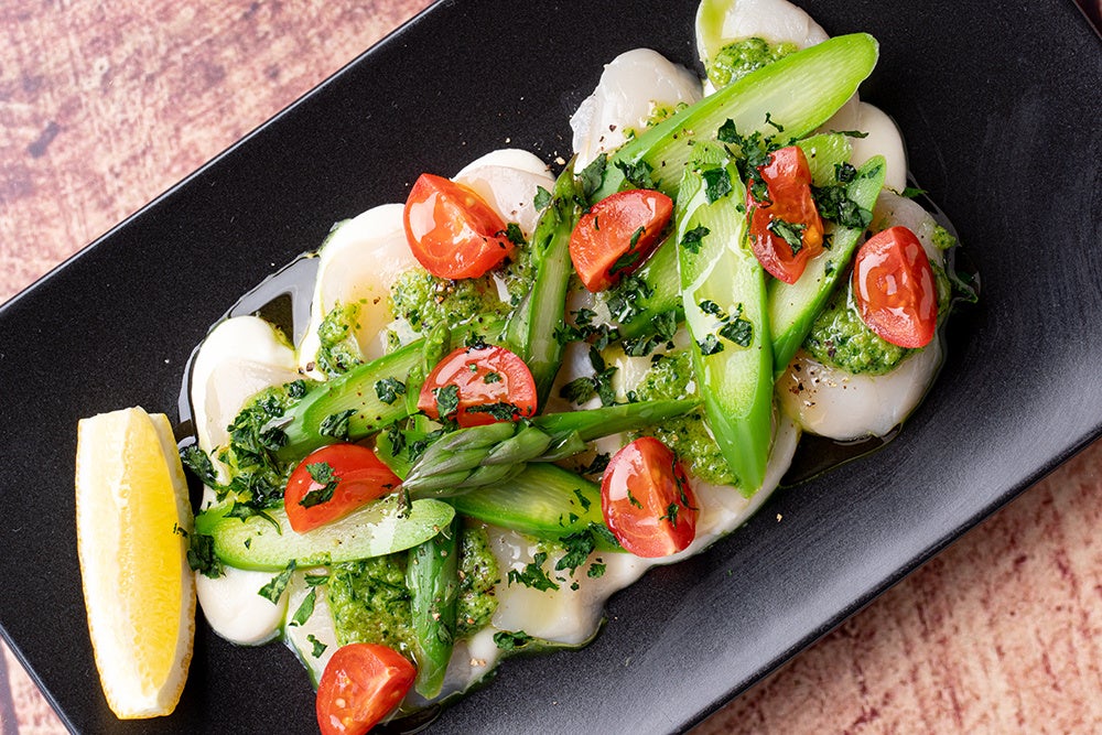 「オホーツク常呂産ホタテ」と「北海道産アスパラ」を「北海道産じゃがいも」のソースとアスパラソースで彩った、贅沢に北海道を楽しめるカルパッチョ。レモンを絞って楽しんで!