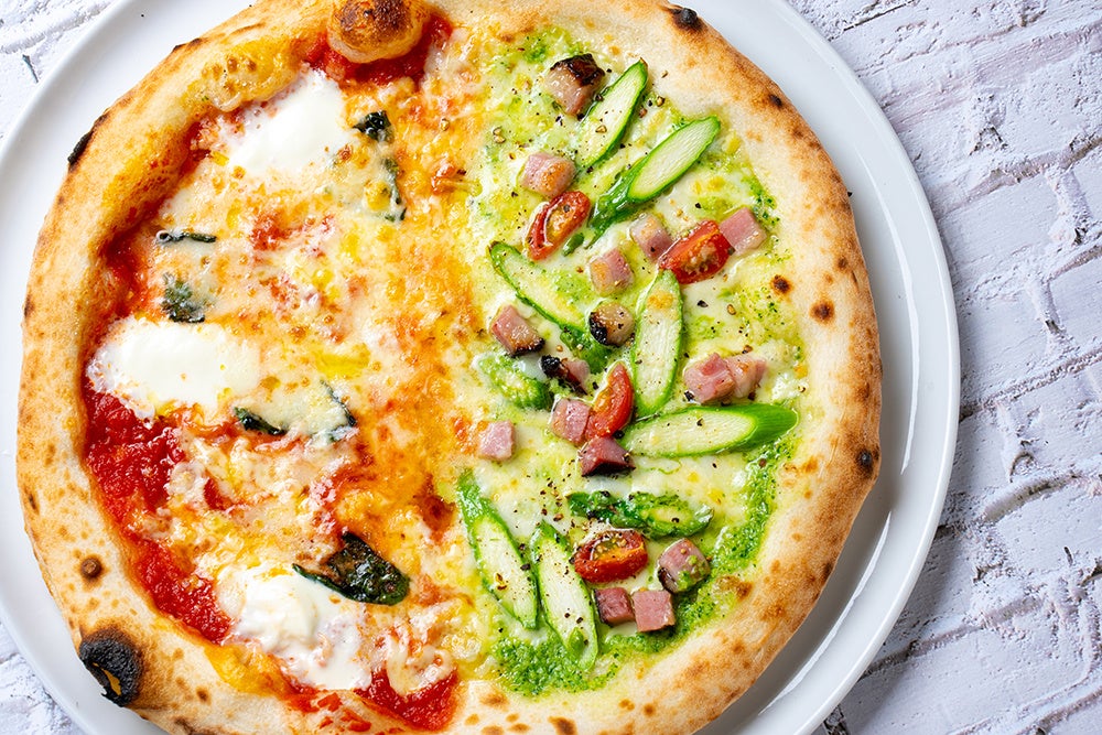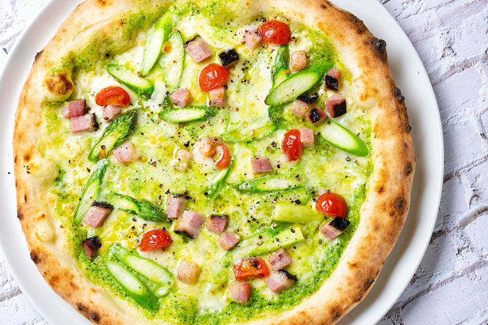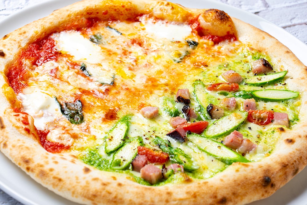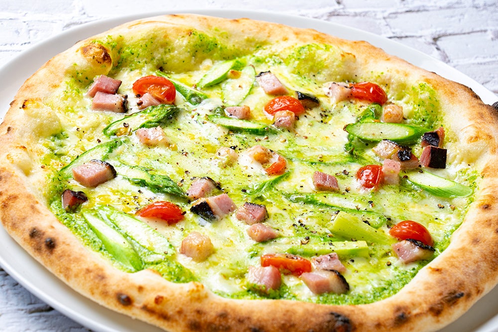 北海道小麦100%のオリジナルピッツァ生地に、「北海道産アスパラ」と「農家のベーコン」の相性バツグンの素材と、アスパラとほうれん草でつくるソースがベストマッチ。モッツァレラチーズとシュレットチーズ、パルミジャーノチーズでコクも味わえる1品。