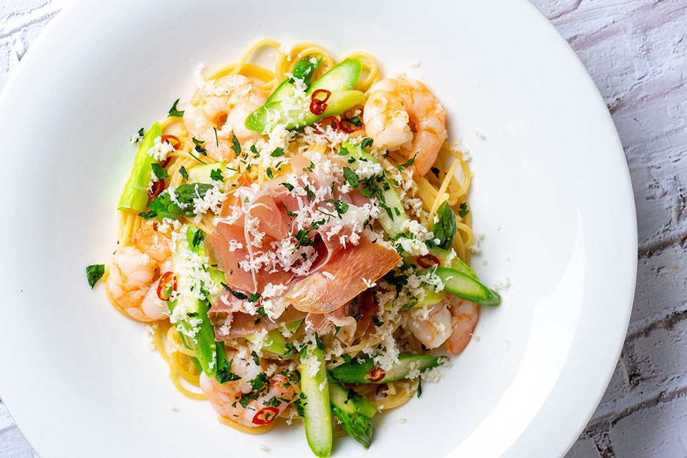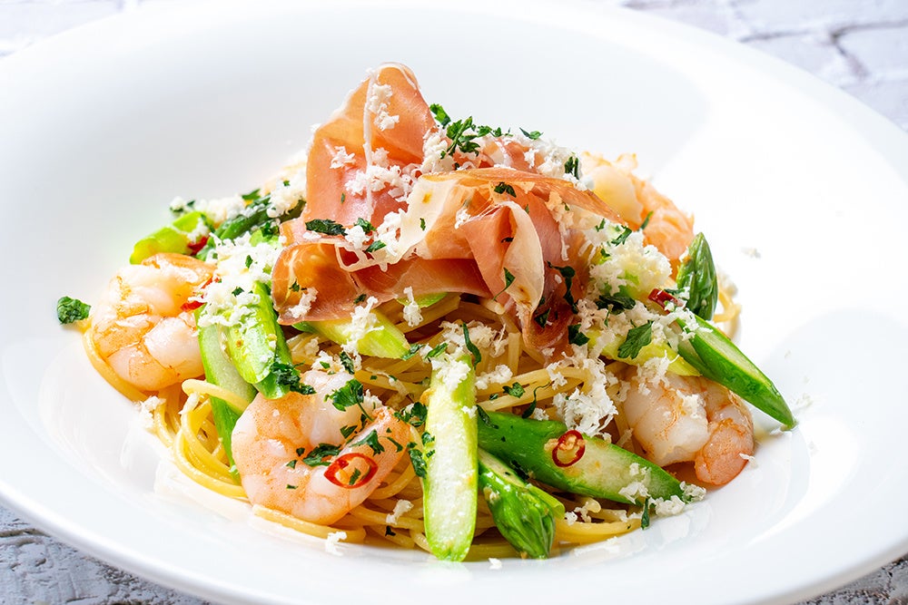 ■メニュー名/北海道産アスパラとぷりぷり海老、生ハムの贅沢スパゲティ 山わさび風味