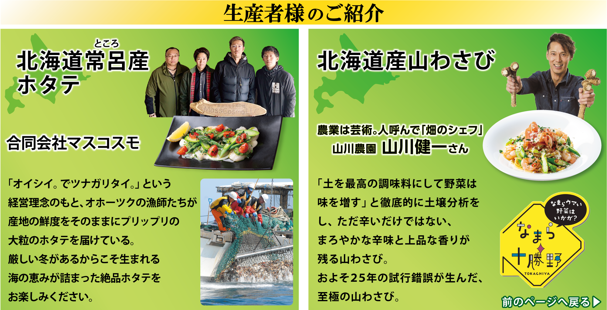 「北海道産アスパラ」、「なまら十勝野 山川農園の山わさび」、「合同会社マスコスモのホタテ」の生産者様の想いをのせた、北海道春メニューを存分にお楽しみください!