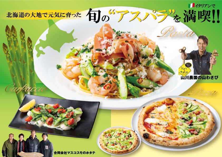 ■北海道イタリアン ミアボッカ 各店にて、北海道の春の旬素材「アスパラ」や、十勝の「山わさび」、常呂産の「ホタテ」を使った至福のメニューが期間限定で登場。