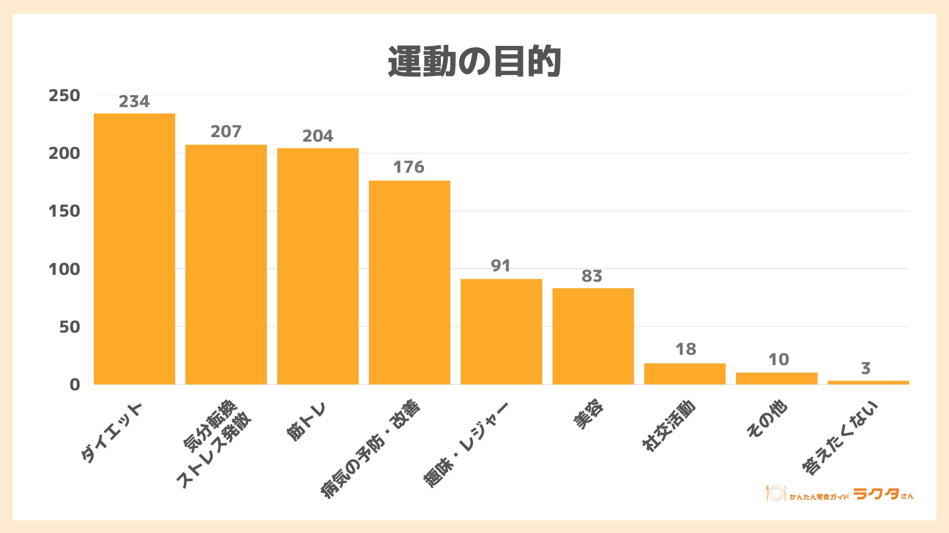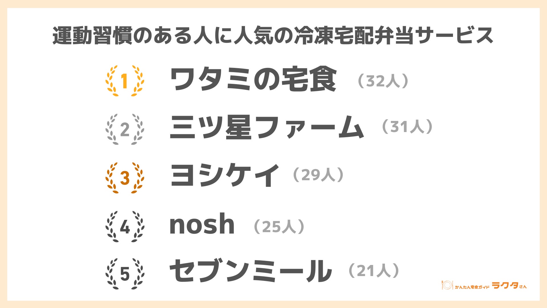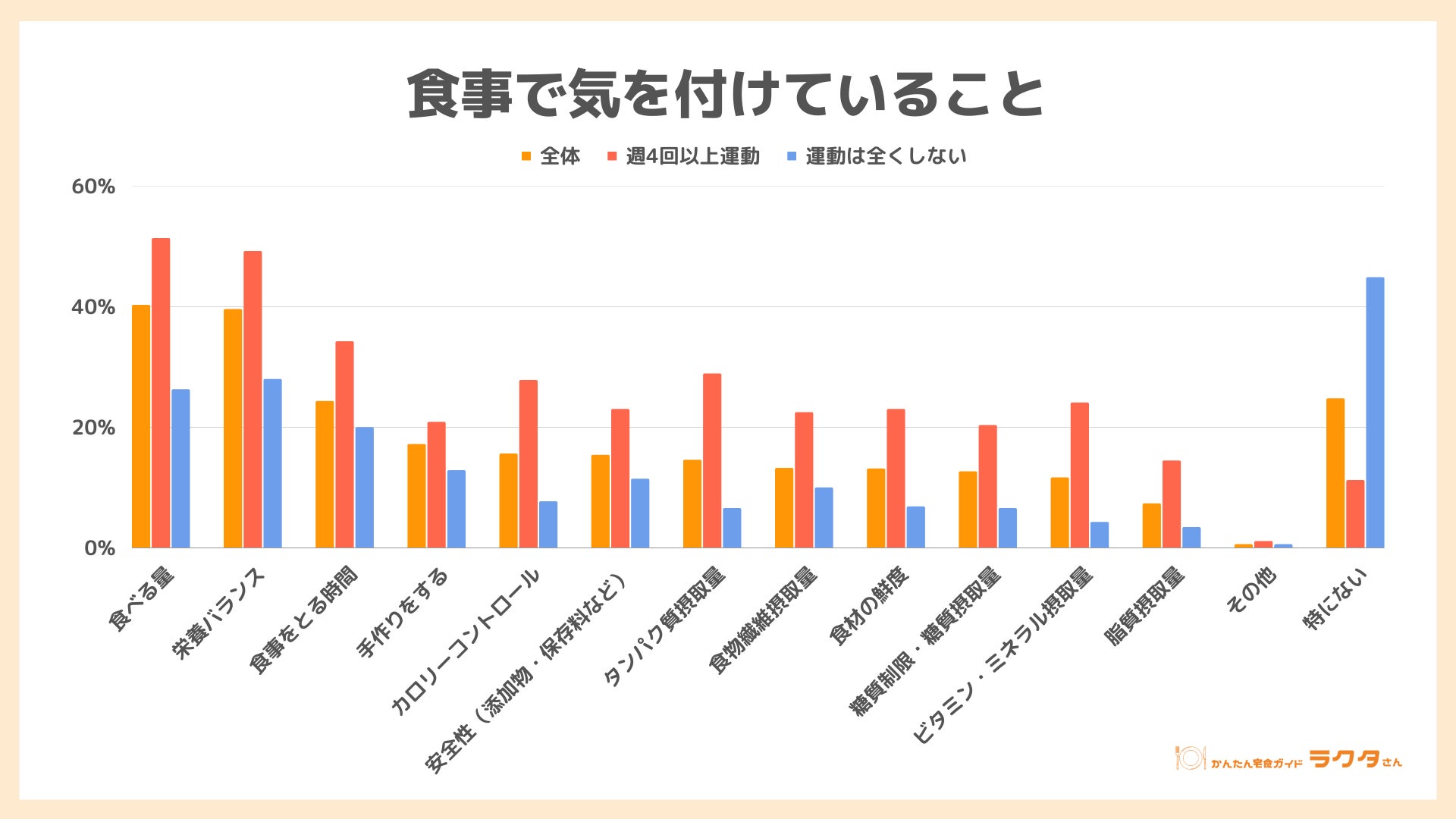 ナイル株式会社(本社:東京都品川区、 代表取締役社長:高橋飛翔、 以下ナイル)が運営する「かんたん宅食ガイド ラクタさん」にて、20代~50代男女884人を対象に、2023年4月11日~4月18日の期間で、運動習慣と食事に関するアンケートを実施しました。