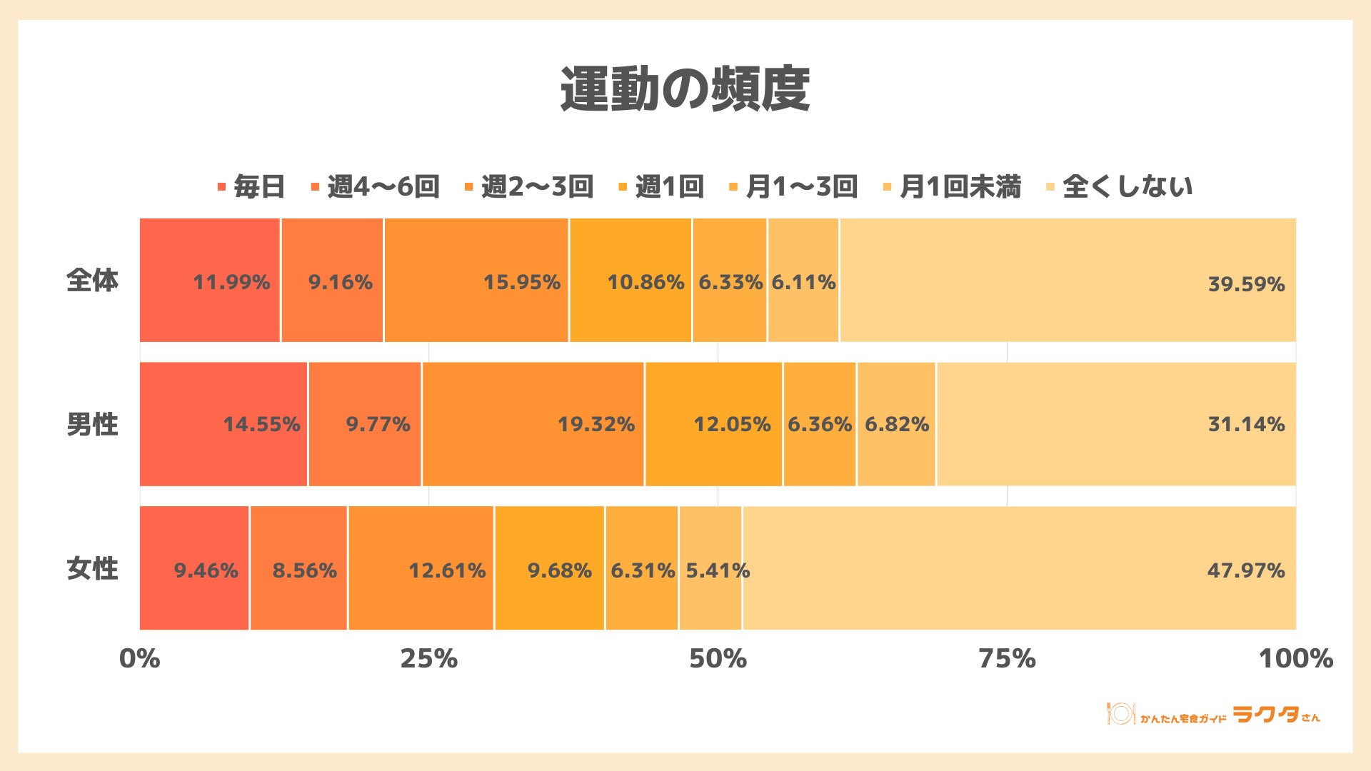 運動を普段どのくらいの頻度で行っているかを質問した結果、最も多かったのは「全くしない」で39.59%。次いで多いのは「週2〜3回」15.95%、「毎日」11.99%でした。約半数が月1回以上の運動をしています。