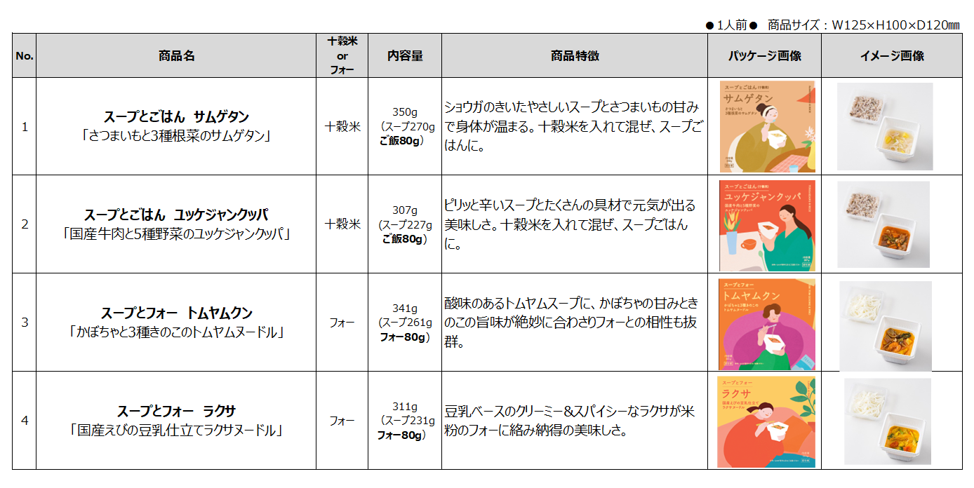 具だくさんのスープに、あえて“ちょっと”のご飯やフォーを組み合わせた、時間を気にせず食べられる一食完結型冷凍食品『いたわりスープごはん』のラインナップです。下段のスープにご飯やフォーを入れ、混ぜて食べるスープごはんは、美味しくヘルシーでありながら満足感を得られるものであり、レンジで手軽に召し上がれます。