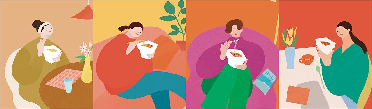 食品のパッケージは、一般的に、美味しそうなシズル写真を載せることが多いのですが、『冷凍スープ弁当』は女性のライフスタイルの中で召し上がるシーンを全面に打ち出すために、あえて写真は使用せずにイラスト仕立てで表現しています。パッケージの女性に自分を照らし合わせながら、ほっと一息、自分をいたわる時間を連想させます。