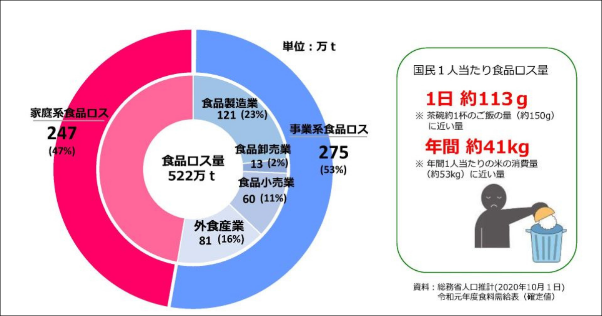 「食品ロス」とは、本来食べられるのにもかかわらず捨てられる食品です。日本の食品ロスは年間522万トン発生しています(R2農水省推計)。この数字は、日本国民が毎日お茶碗一杯分のご飯を廃棄しているのと相当します。年間522万トンの食品ロスのうち、約53%が主に製造・流通段階で発生する事業系食品ロスとされています。