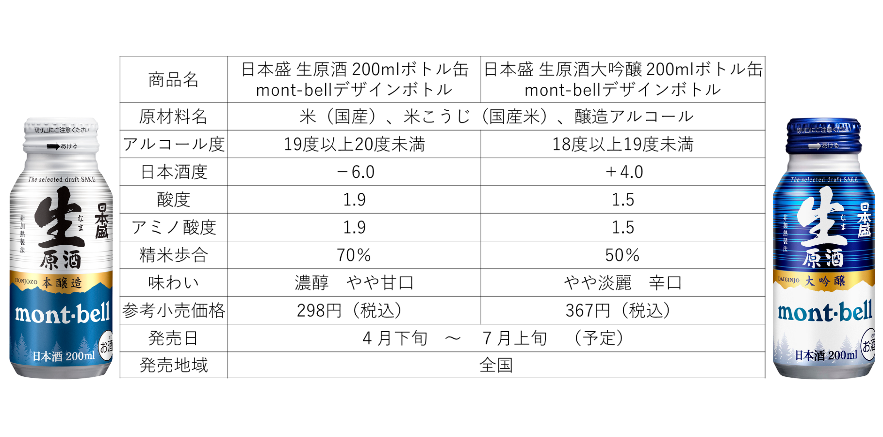 日本盛株式会社(本社:兵庫県西宮市、代表取締役社長:森本 太郎)は、「日本盛 生原酒 200mlボトル缶 mont-bellデザインボトル(本醸造、大吟醸)」を2023年4月下旬より、期間・数量限定で発売いたします。