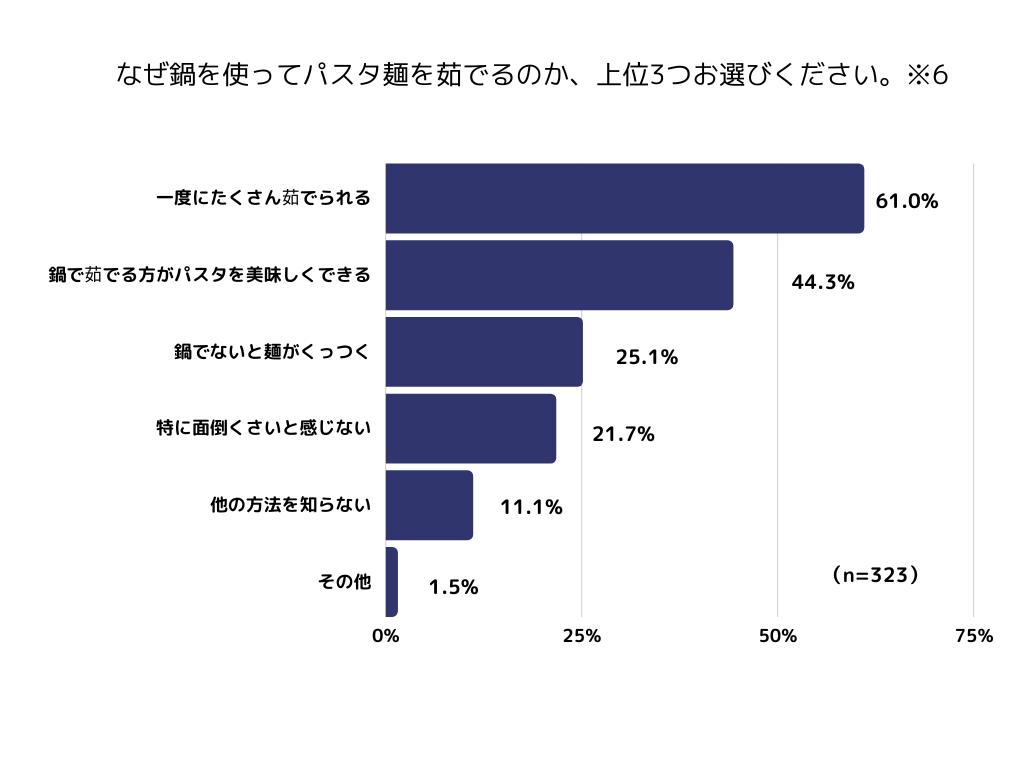 一方、「鍋で茹でる方がパスタを美味しくできる(44.3%)」、「鍋でないと麺がくっつく(25.1%)」との意見も挙がっており、料理の完成度や美味しさを求め、「麺を鍋で茹でる」ことを“あえて”選択している方が多いこともわかりました。