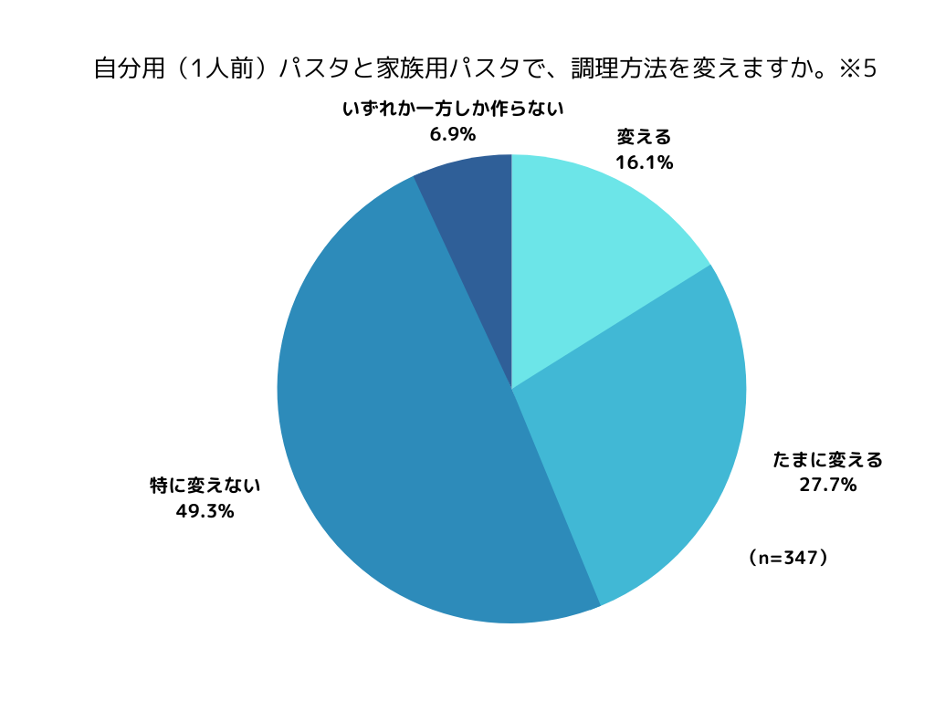 さらに、「自分用(1人前)パスタと家族用パスタで、調理方法を変えているか」という問いに対して、半数近くの49.3%が「特に変えていない」ことがわかりました。(※5)
