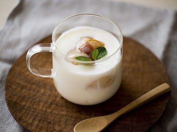 アコメヤの濃厚甘酒を牛乳で割り、発酵レモンのハニーソースを加えました。