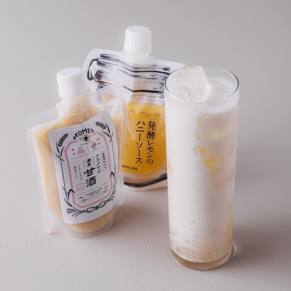 アコメヤの濃厚甘酒を牛乳で割り、発酵レモンのハニーソースを加えました。