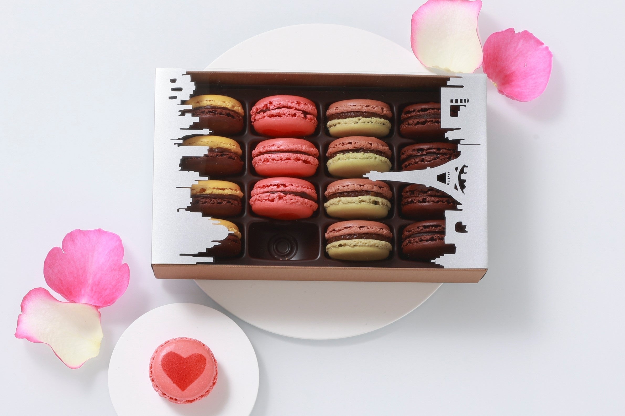 ハートが描かれた期間限定の「マカロン ローズ メルシー」を含む、マカロン16個詰合せ。ガナッシュをサンドしたショコラティエならではの味わい。