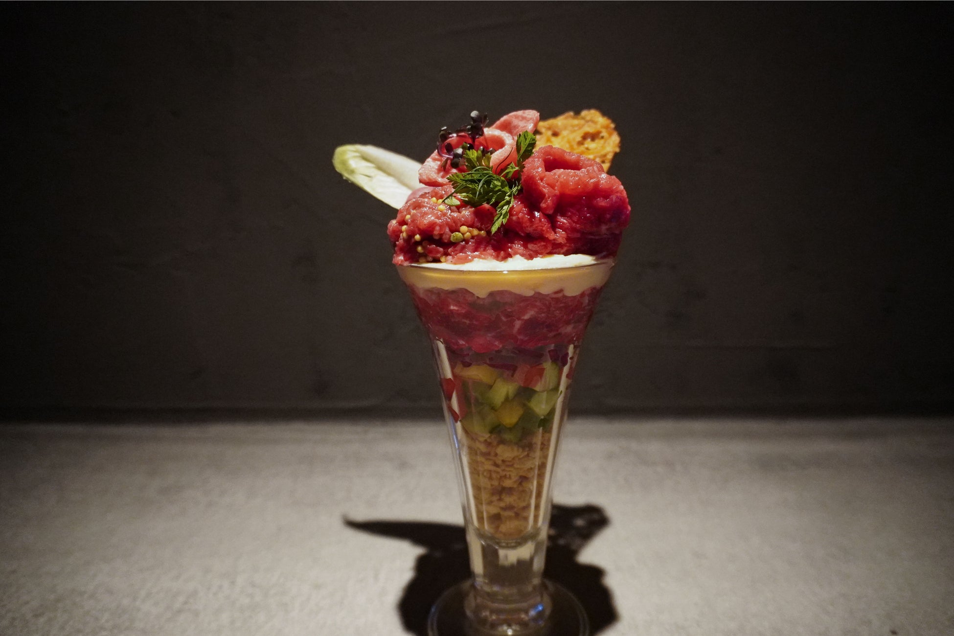 和牛と香味野菜をあわせたタルタルは、和牛本来の旨みと香味野菜のシャキシャキ感やさわやかな香りが食欲をそそります。パフェのようにスプーンですくってお召し上がりいただけます。
