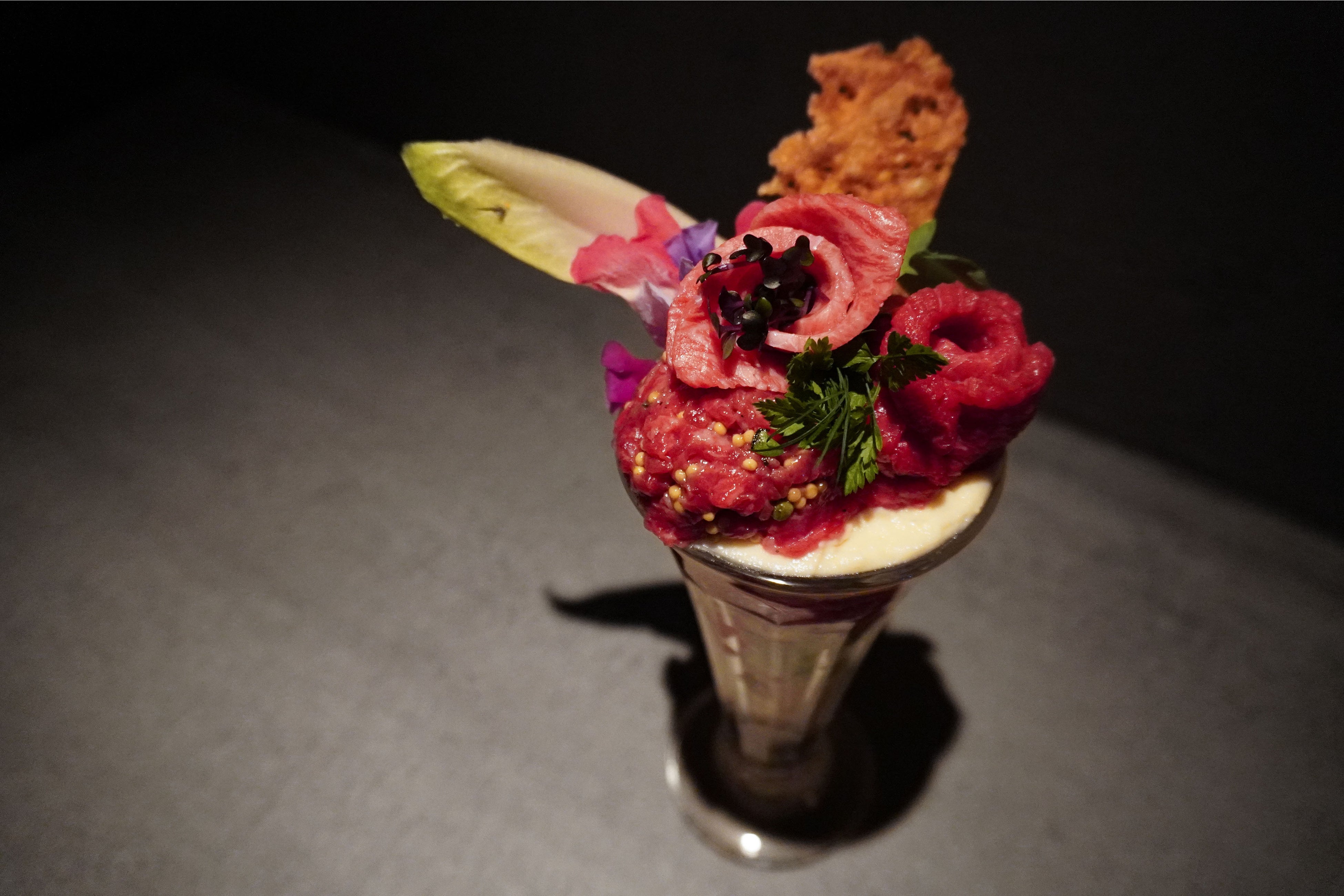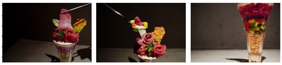和牛と香味野菜をあわせたタルタルは、和牛本来の旨みと香味野菜のシャキシャキ感やさわやかな香りが食欲をそそります。パフェのようにスプーンですくってお召し上がりいただけます。