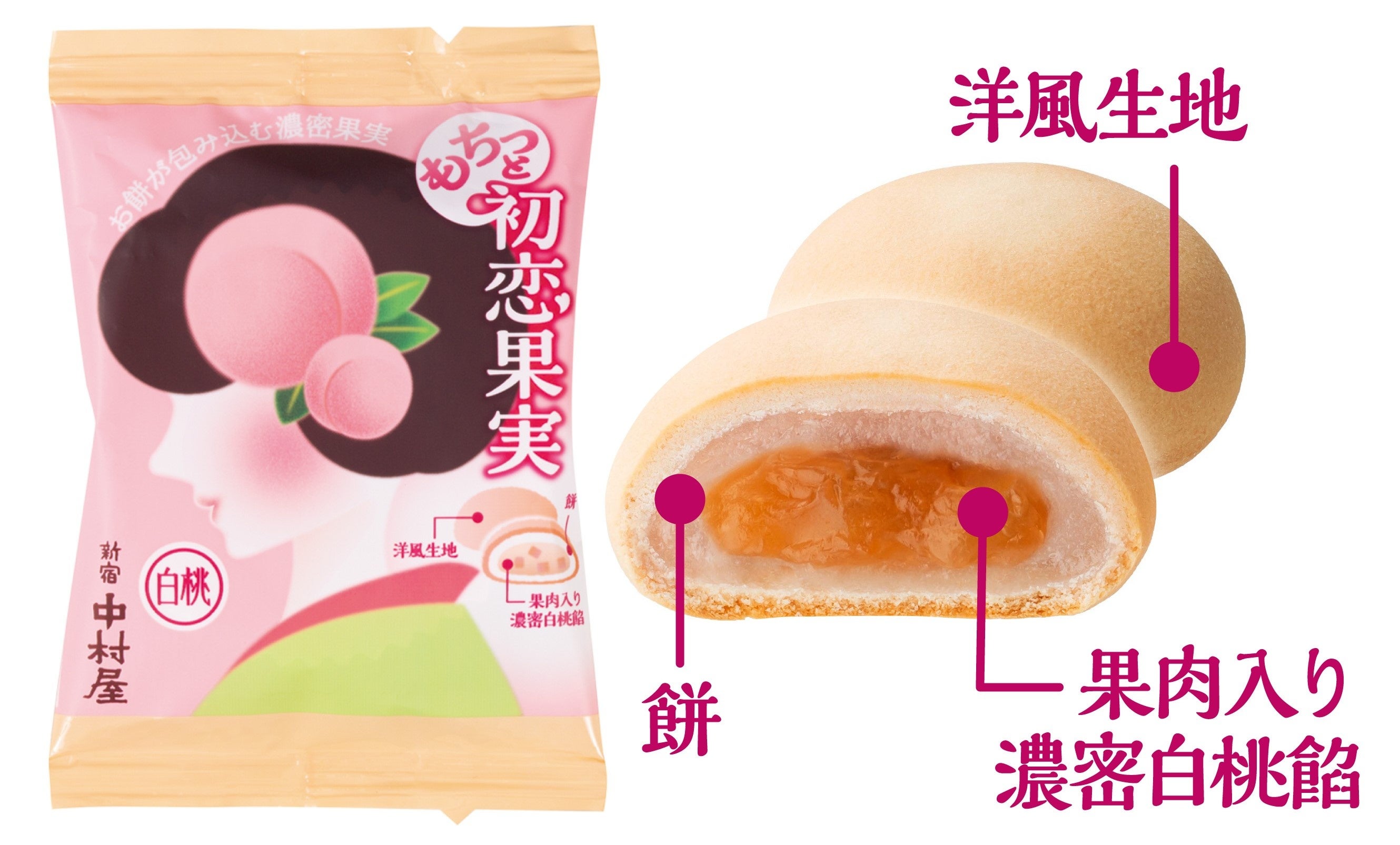 ■商品説明:国産白桃果汁を使用した、果肉感のある濃密な白桃餡をお餅で包み、さらにしっとりした洋風生地で包んで焼き上げました。
