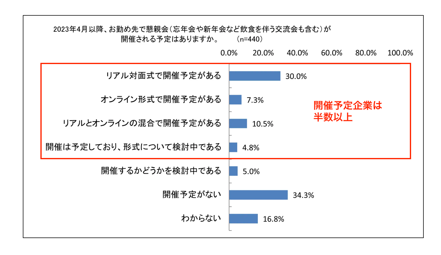 新型コロナウイルスが2023年5月8日以降、5類へと分類が引き下げられることが決定したことは記憶に新しいかと思います。そこで、新年度4月より対面での懇親会を実施する計画があるかどうかを調査したところ、以下のような結果となりました。