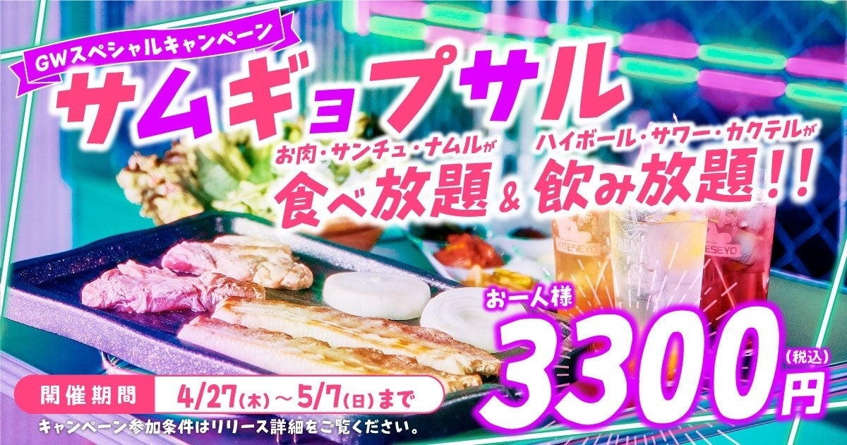 4月27日(木)~5月7日(日)の期間、お肉2種、野菜7種、薬味とキムチの7種セット全部が食べ放題の「サムギョプサル食べ放題」を飲み放題付きで2時間3,300円でご提供!