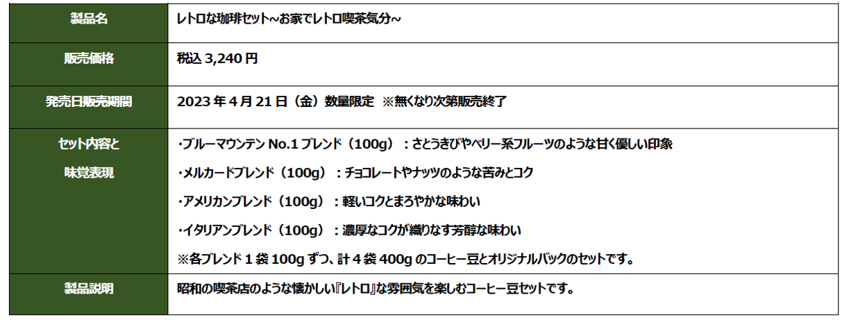 UCCは今年で創業90周年を迎えます。1970年より展開をし始めたのが「UCCカフェメルカード」でした。喫茶店でコーヒーを飲む文化が根強かった当時、UCCは「一人でも多くのお客さまへおいしいコーヒーをお届けしたい」という思いのもと、喫茶店にコーヒー豆の挽き売り業態を併設した「UCCカフェメルカード」を全国に展開しました。そして2023年現在に至るまで50年余りにわたり、お客さまにおいしいコーヒーをお届けし続けています。今回は長年ご愛顧いただいている皆さまに感謝の気持ちを込め、開業当初1970年代の面影を感じていただける昭和の喫茶店のような懐かしい「レトロ」な雰囲気を、ご自宅でもお楽しみいただけるよう、4種類のコーヒー豆(ブルーマウンテンNo.1ブレンド・メルカードブレンド・アメリカンブレンド・イタリアンブレンド各100gずつ)を、オリジナルのバックとともに販売します。また、併設の喫茶コーナーでは純喫茶ならではの『ちょっとレトロなメニュー』をご用意しています。