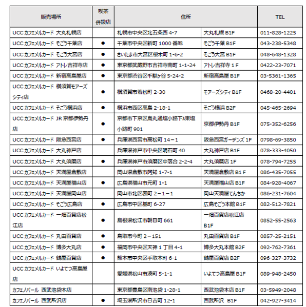 取り扱い店舗一覧(コーヒー豆の挽き売り業態『UCCカフェメルカード』20店舗、『カフェノバール』2店舗 計22店舗)