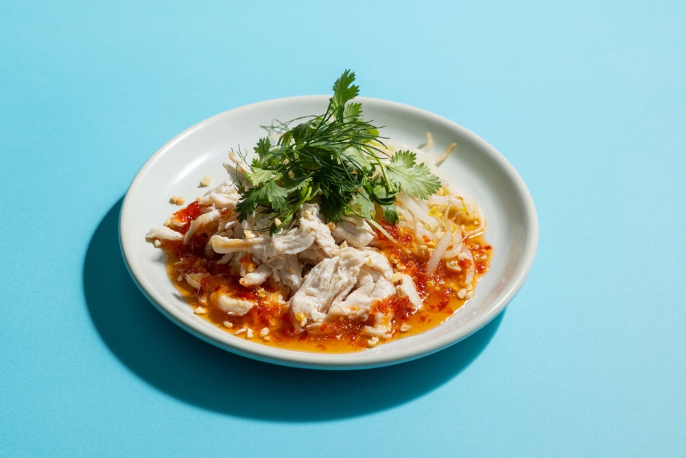 柔らかく蒸した鶏肉と野菜でさっぱりな仕上がりに。甘辛いチリソースと香草がアクセントとなり本格的な味わいが食欲を誘います。