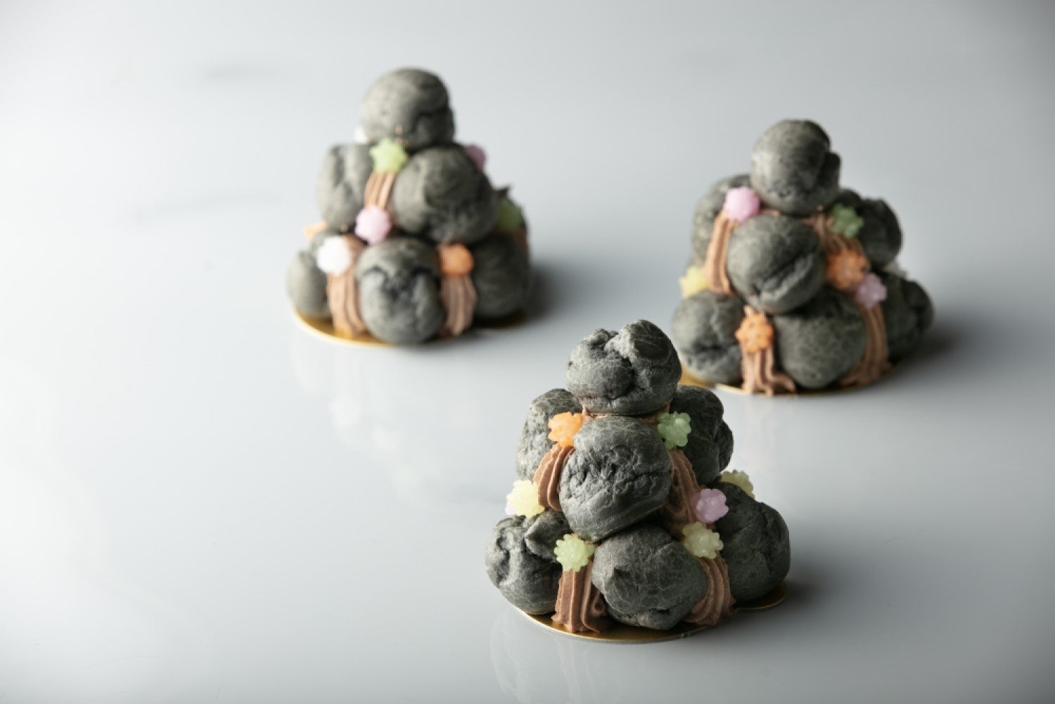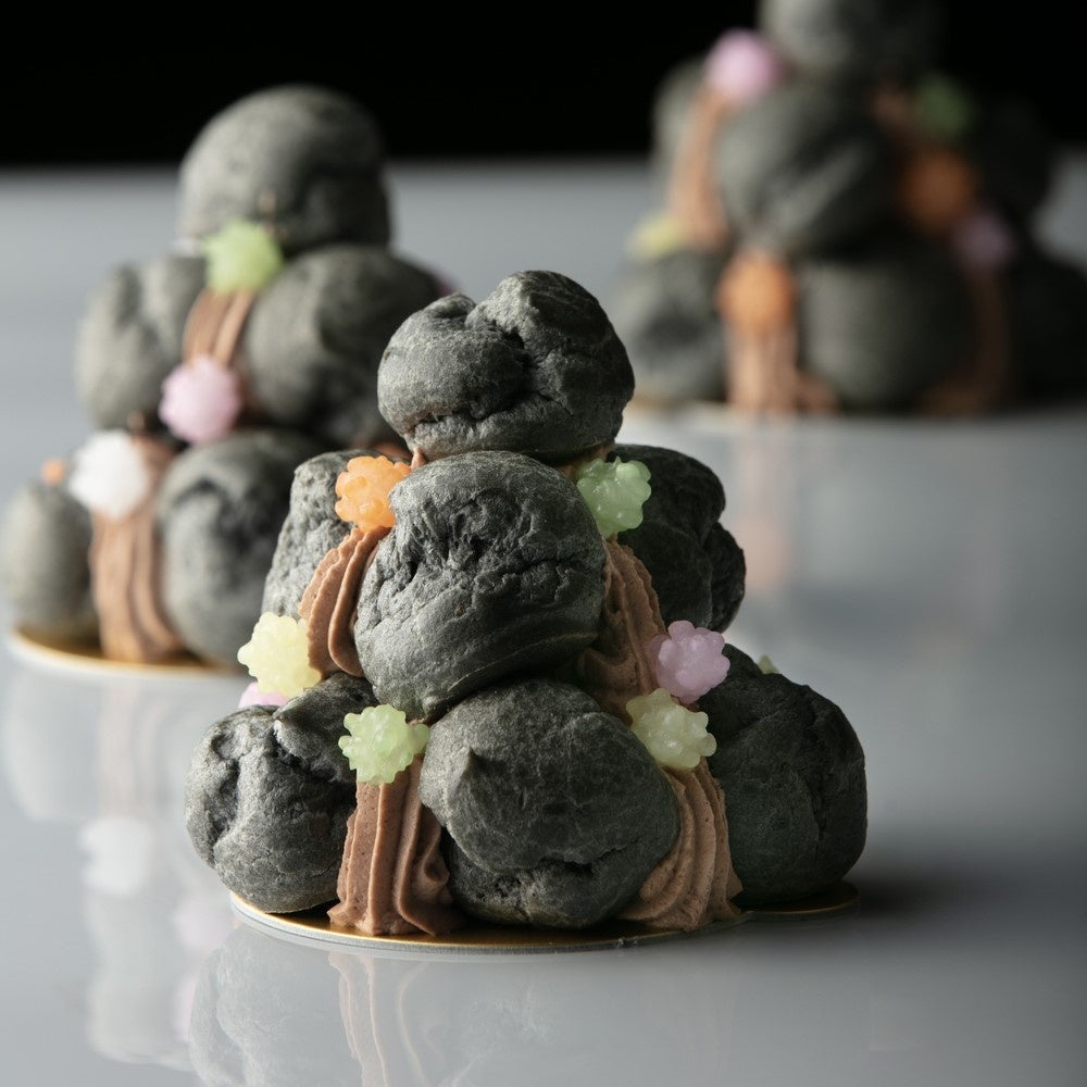 【商品 内容】 竹炭を使用した黒色のシュークリーム。ふんわり軽い生地の中には、黒ゴマと白ゴマの