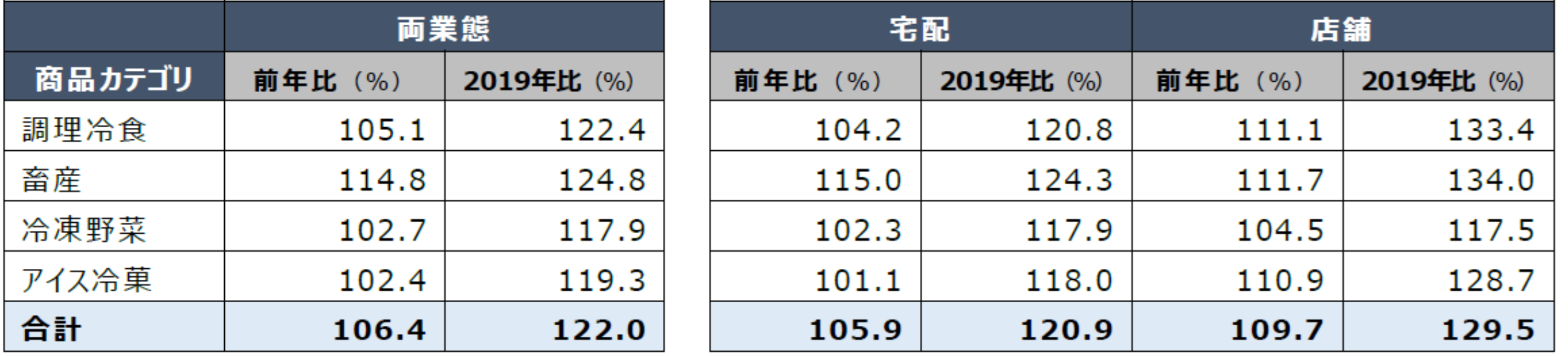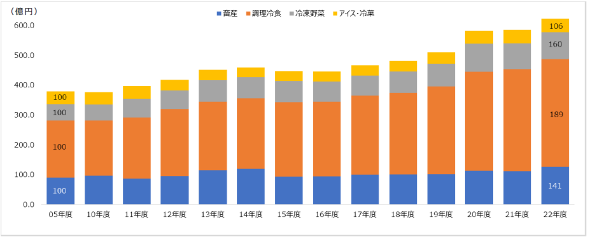 冷凍食品市場が拡大し始める以前の2005年度の供給金額(売上高)と比較すると、2022年度は164%に伸長しました。商品カテゴリ別には年々伸長を続ける調理冷食が2005年度比189%、冷凍野菜は2005年度比160%と大きく拡大しました。