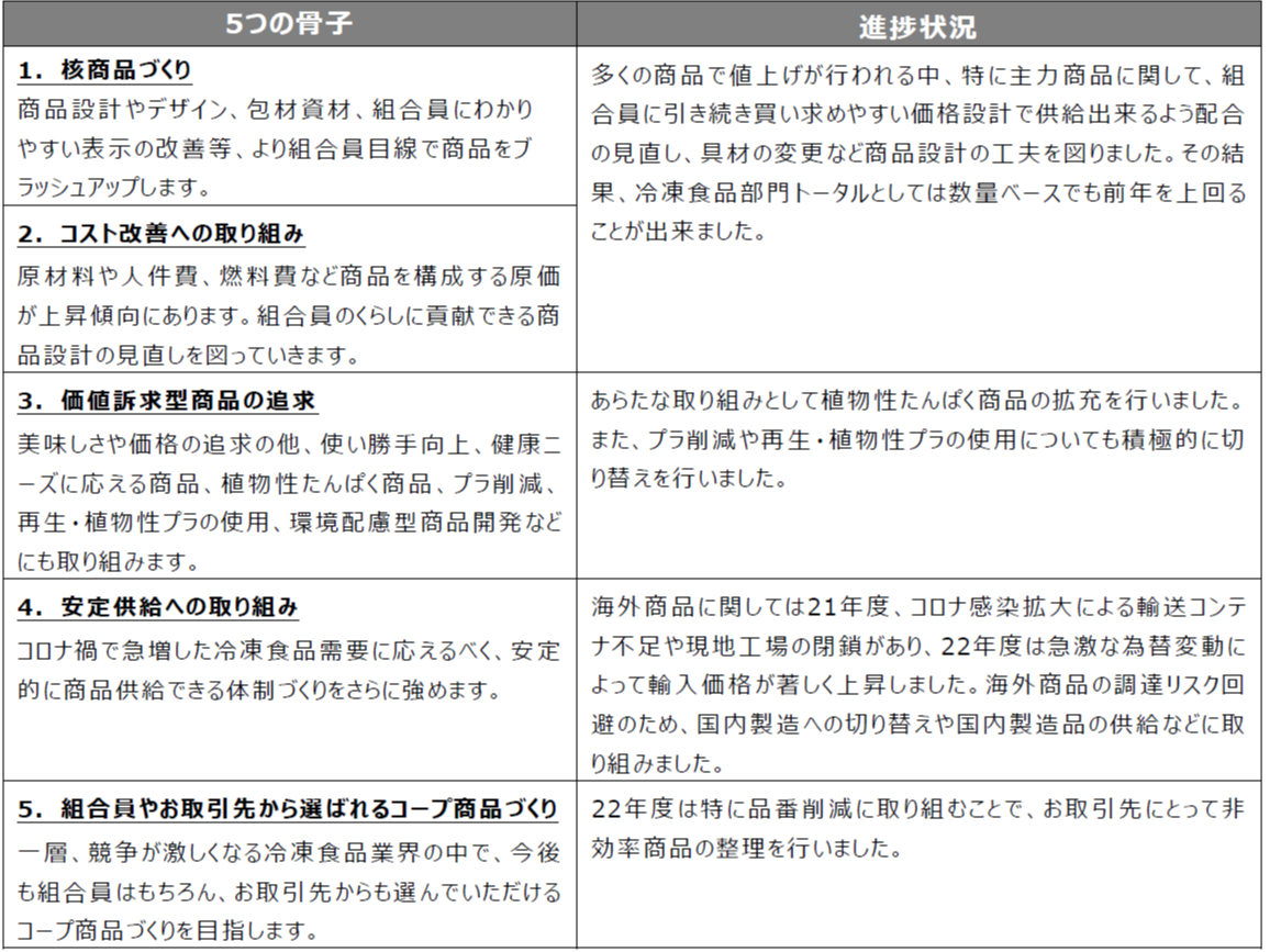 2022年度に設定した冷凍食品5つの骨子を引き続き今年度も踏襲し、商品力強化に努めてまいります。