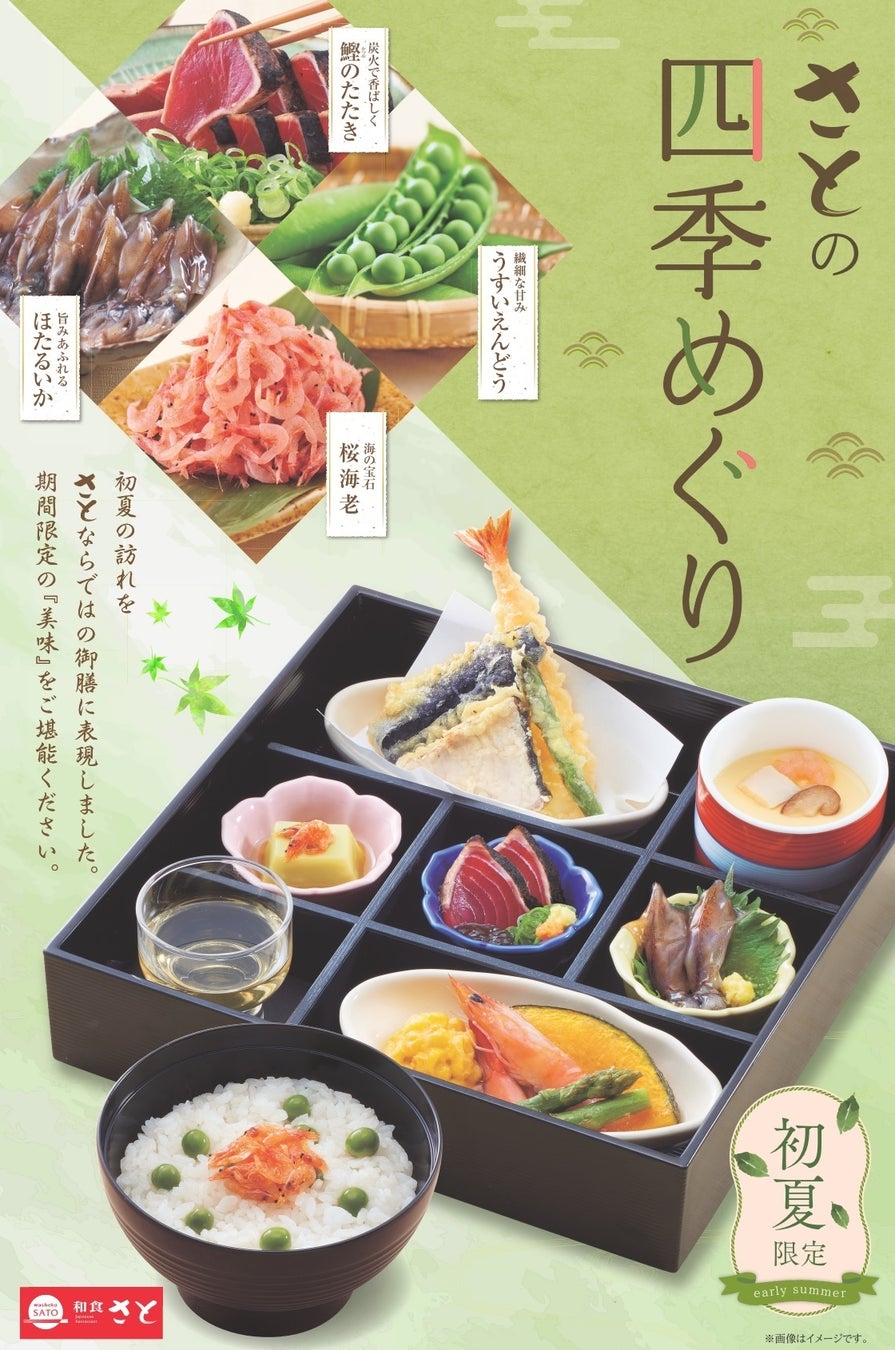 また、4月20日(木)同日より、旬の「鰹(かつお)」や「うすいえんどう」「桜海老」「ほたるいか」などを使用した初夏限定の御膳メニューを6月中旬までの予定で販売します。