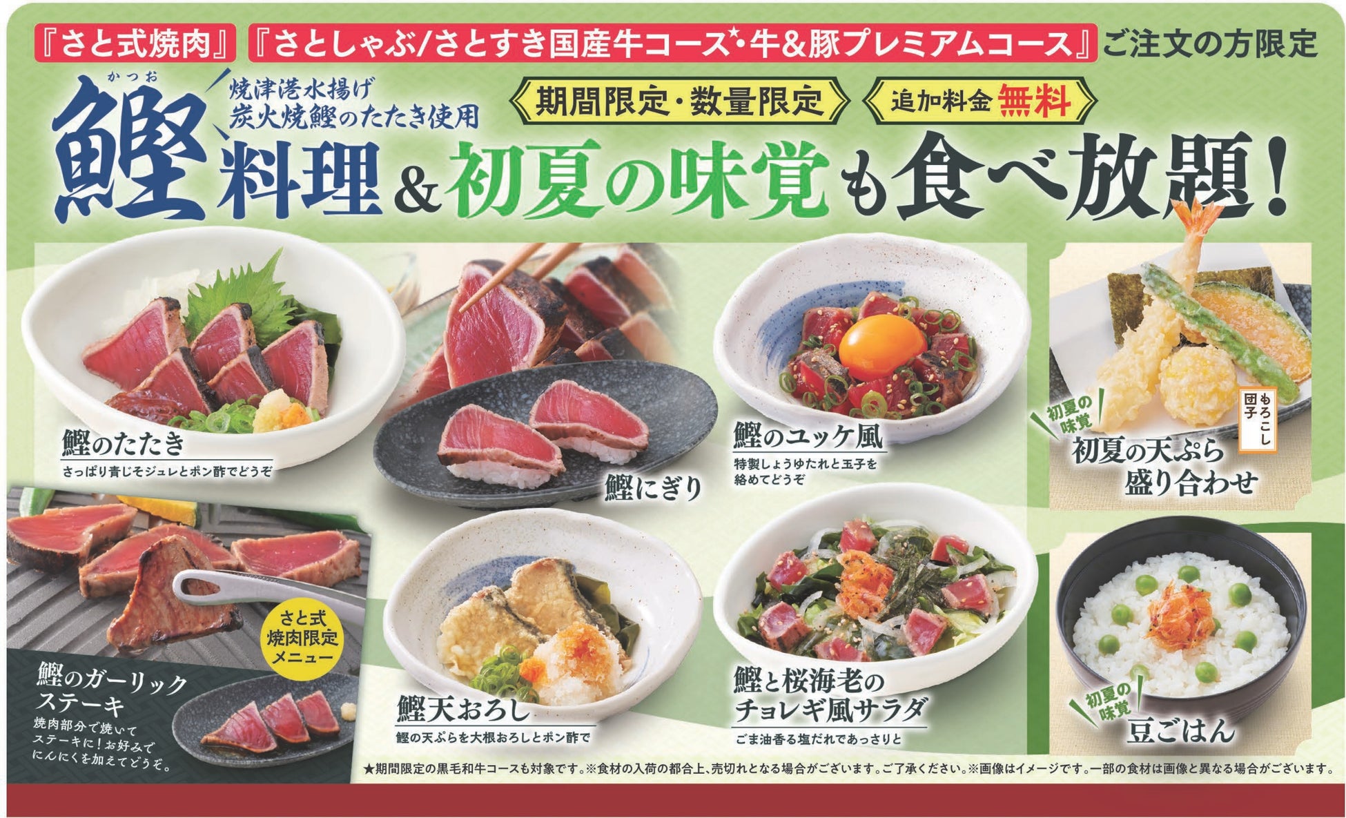 国内197店舗を展開する「和食さと」では、人気の焼肉食べ放題「さと式焼肉」や、しゃぶしゃぶ食べ放題「さとしゃぶ」の牛&豚プレミアムコース以上をご注文すると、静岡県焼津港水揚げの炭火焼「鰹のたたき」などの鰹料理が追加料金無料で食べ放題のお得なイベントを開催します。