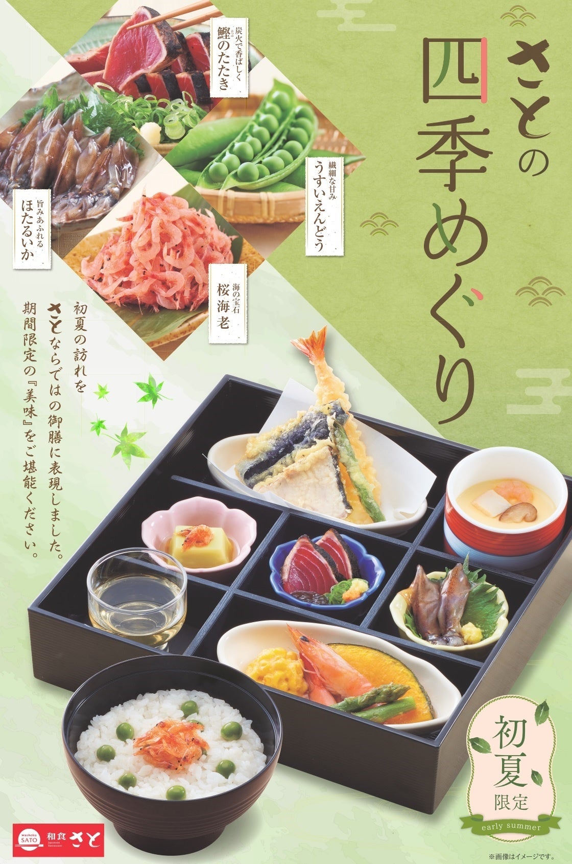 また、4月20日(木)同日より、旬の「鰹(かつお)」や「うすいえんどう」「桜海老」「ほたるいか」などを使用した初夏限定の御膳メニューを6月中旬までの予定で販売します。