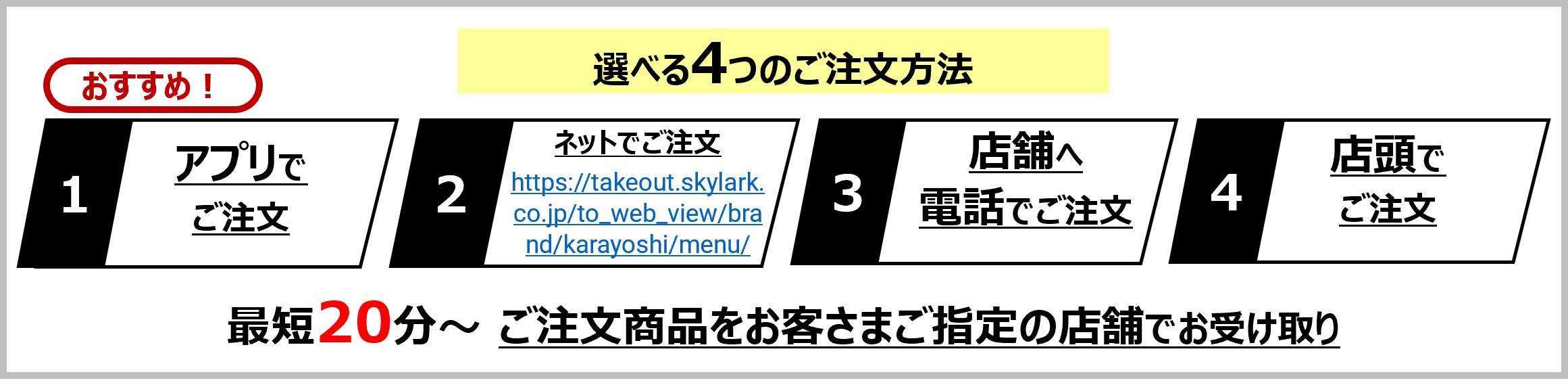 ・テイクアウト専用サイトURL :https://takeout.skylark.co.jp/to_web_view/brand/karayoshi/menu/
