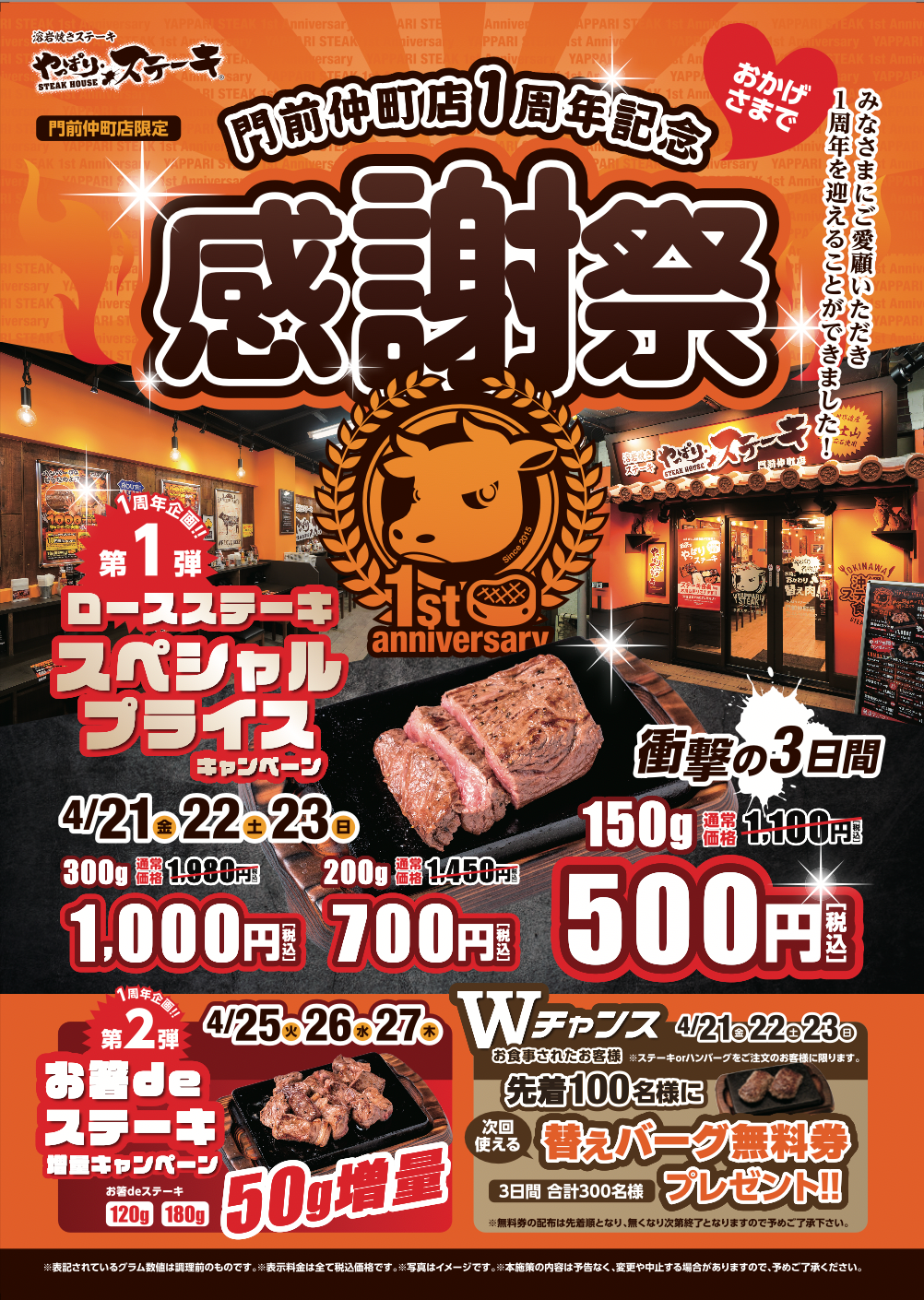 ■やっぱりステーキ門前仲町店が1周年!超お得なキャンペーンを実施致します。