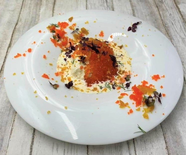 ポテトサラダに、たっぷりのイクラ、トビコ、自家製カラスミをのせました。
