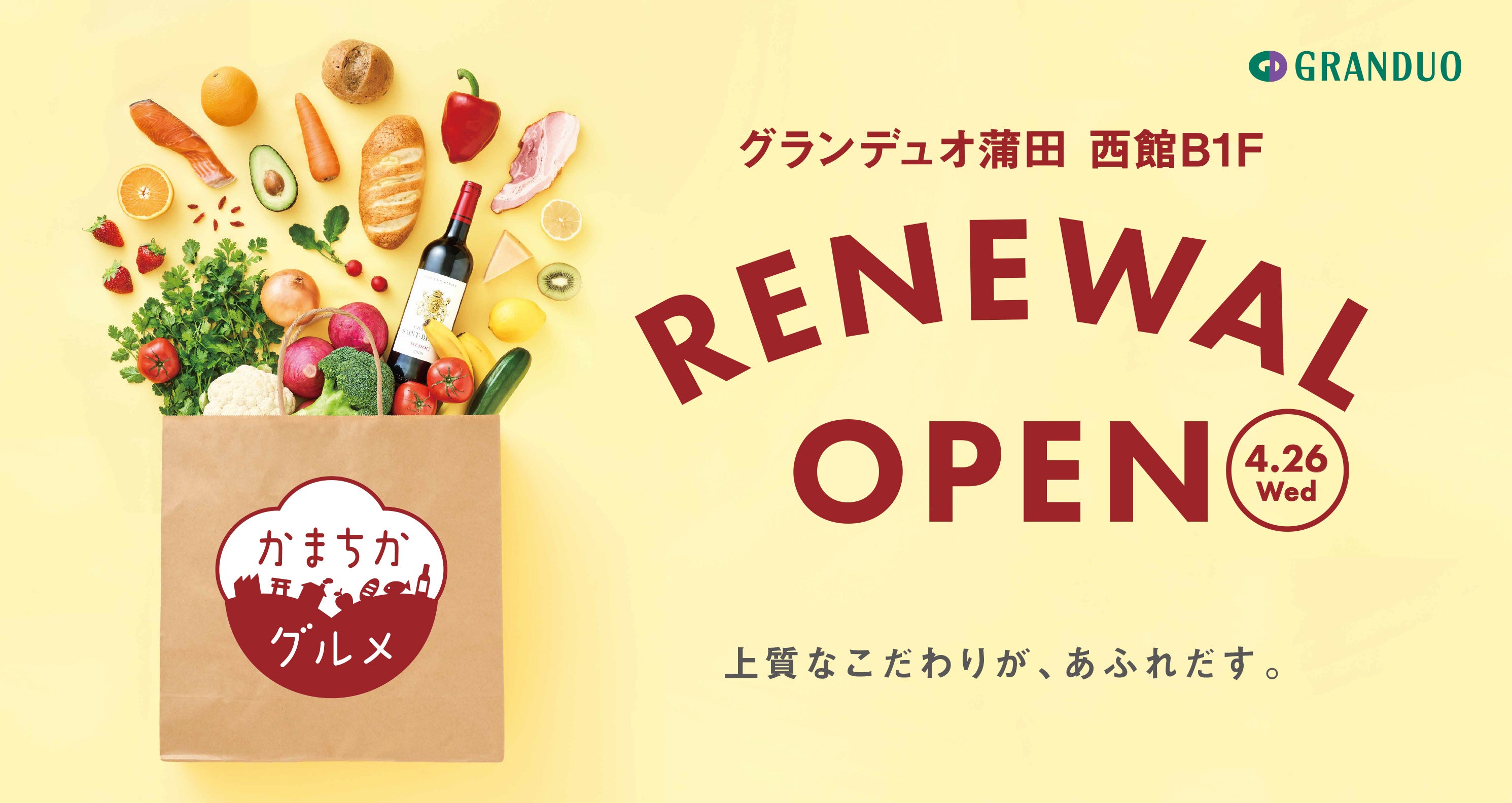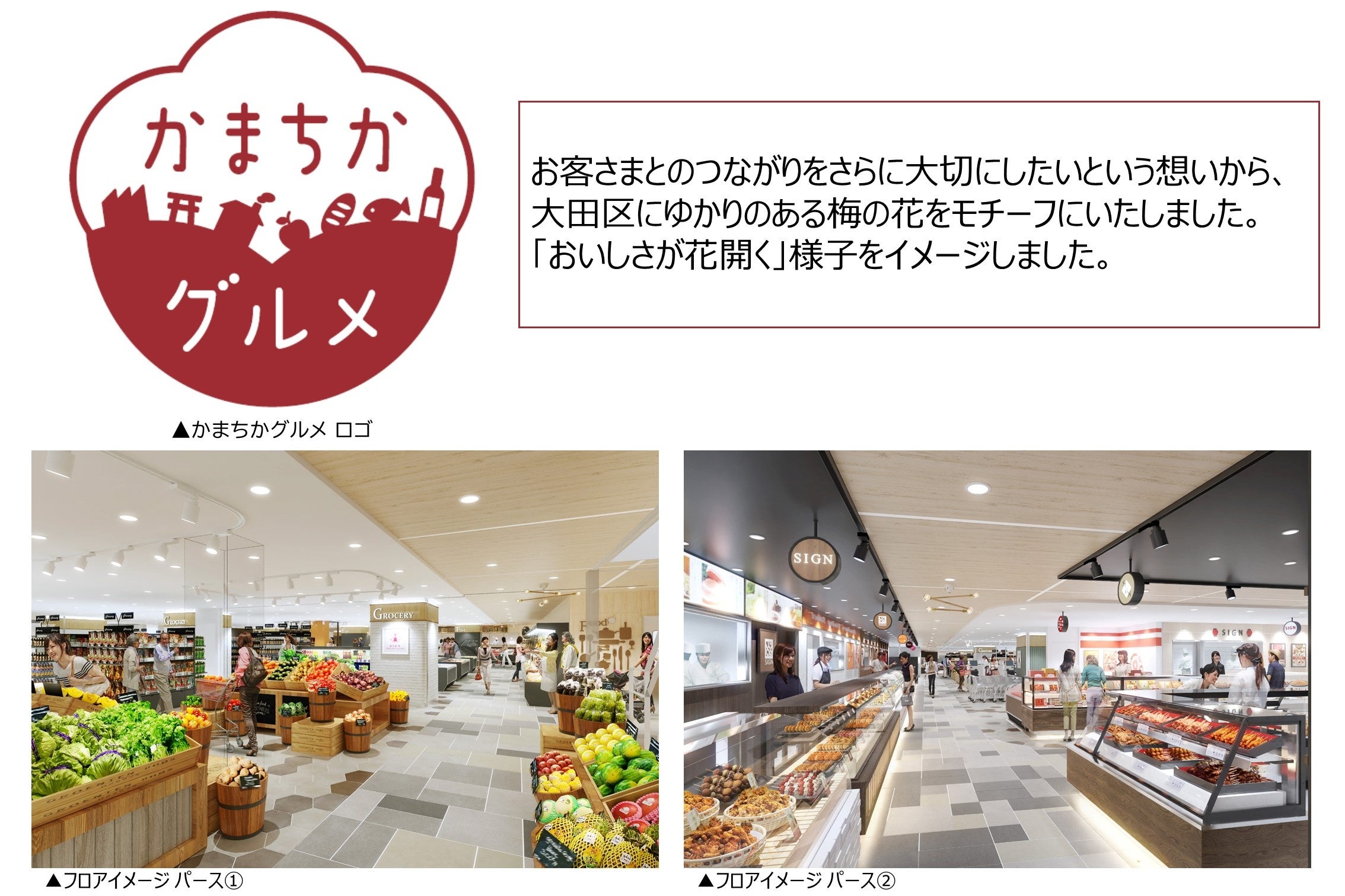 グランデュオ蒲田西館地下1階食品フロアは、2008年の開業より、「駅地下市場」という名称でお客さまの毎日に寄り添ってまいりました。15年間お客さまと築いたつながりを大切にしていきたいという想いと、これからも蒲田のお客さまと、より深く強くつながっていきたいという想いから、フロア名称を「駅の地下」から「かまたの地下」へ改め、「かまちかグルメ」といたしました。
