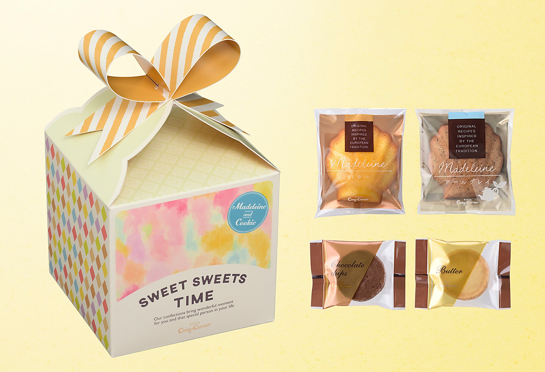 銀座コージーコーナーでは、母の日限定のスイーツを多彩にご用意しました。お花をイメージした華やかな2種類のプチデコレーションや、家族みんなで楽しめる可愛いプチケーキのアソートなどをラインアップ。さらに今年は、マドレーヌとクッキーのアソート「スウィートスイーツタイム(10個入)」が初登場。リボンをかけたプレゼント箱をモチーフにしたBOX入りで、母の日のギフトにぴったりです。