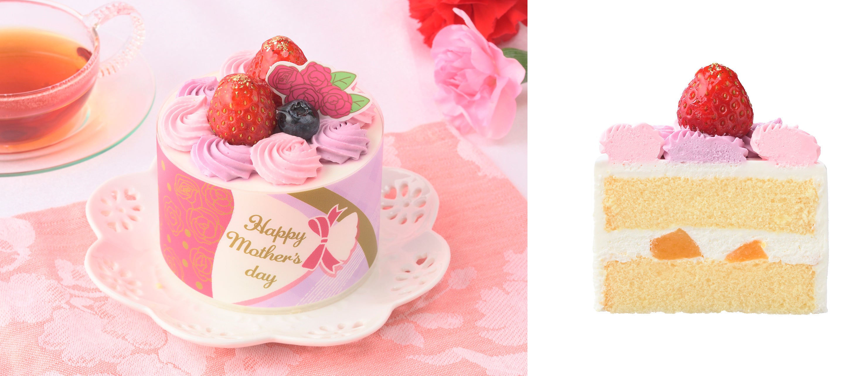 華やかに咲く一輪の花をイメージして、苺クリームのフリルを4段に重ねて飾った母の日限定プチデコレーションケーキです。爽やかな味わいのチーズ風味クリームと、苺&ラズベリージャムをブルーベリー風味スポンジでサンドしました。もう1つの母の日限定プチデコレーションケーキ「母の日コージープリンセス」と隣合わせに並べると、フィルムそれぞれに描かれたバラが合わさって1つの大きな“花束”になります。「ありがとう」の想いを添えて、スウィートな花束をお母さんへ。