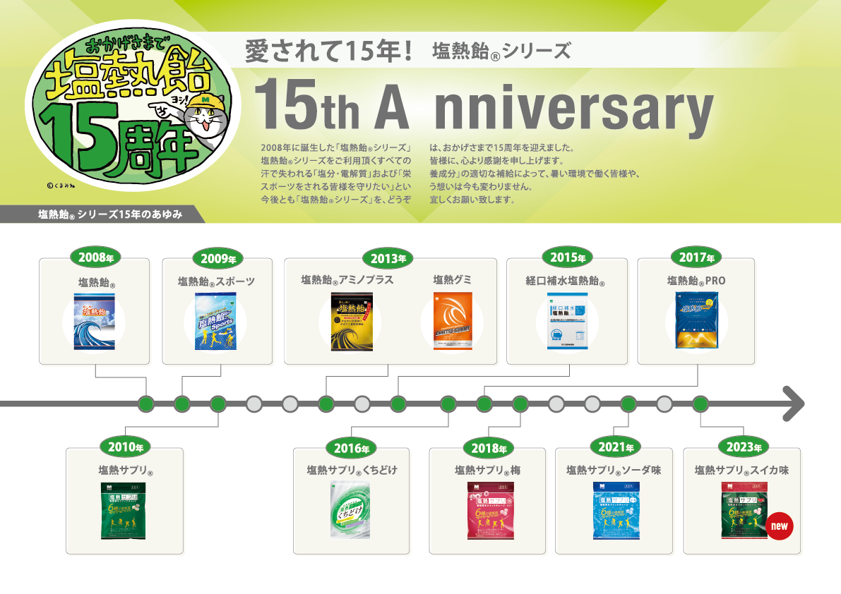 2008年より販売を開始した「塩熱飴®シリーズ」は、2023年5月21日で発売から15周年を迎えます。