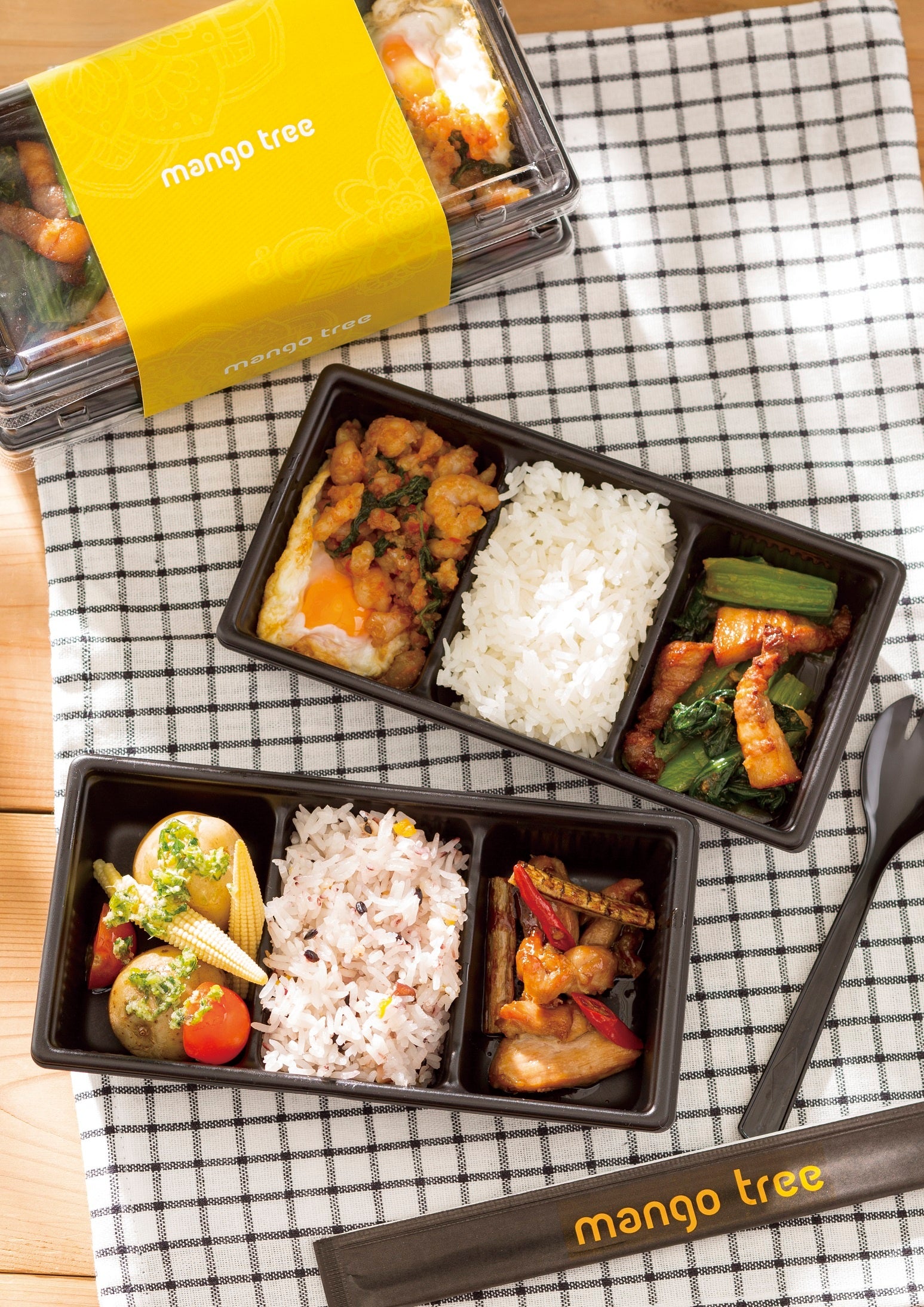 イートインでは、少しずついろいろな種類のおかずをごはんと一緒に食べるタイのストリートフードのような感覚で、テイクアウトでは、タイの段々重ねの手提げお弁当箱“ピントー”をヒントに2段重ねのお弁当に仕上げました。ゴールデンウィークのおでかけなどにもぴったりです。