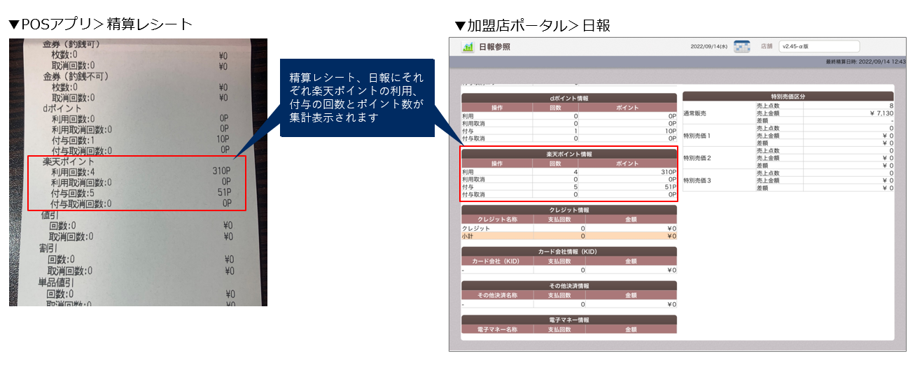 集計の帳票は、精算レシート、日報にそれぞれ「楽天ポイント」の利用、付与の回数とポイント数が集計表示されます。