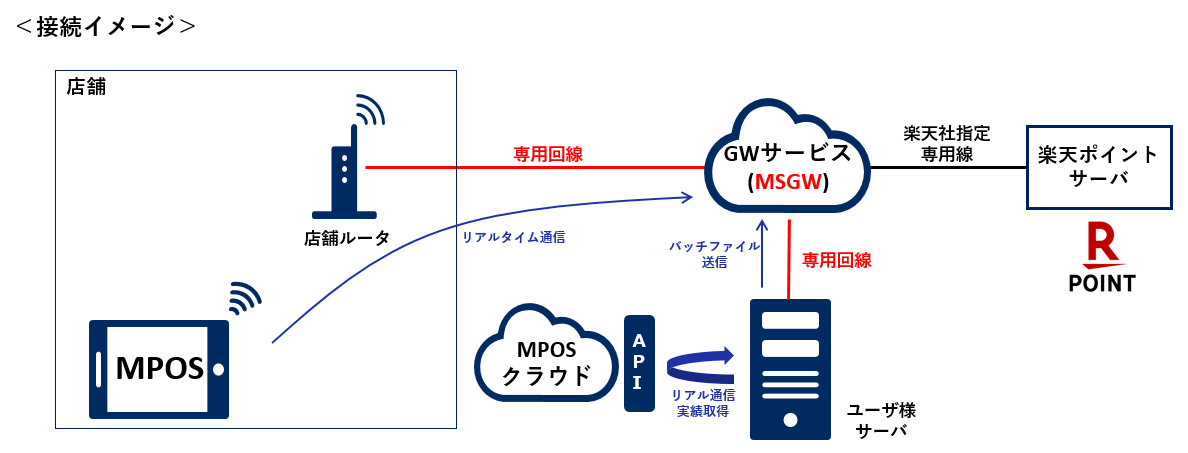 NEC提供の決済ゲートウェイサービス「MSGW」と接続して「楽天ポイント」の付与、利用ができるようになります。本機能の利用にはMSGWとのサービス契約、NECモバイルPOSの「共通ポイント連携オプション」への申し込みが必要となります。
