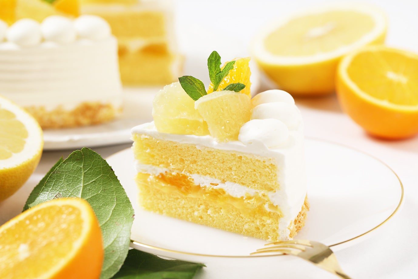 オレンジとホワイトグレープフルーツを使用し、みずみずしくフレッシュな味わいをお楽しみいただける季節のショートケーキです。ふわふわのスポンジでレモンカードとカスタードを合わせたクリームをサンドし、初夏にぴったりの爽やかな味わいに仕上げました。