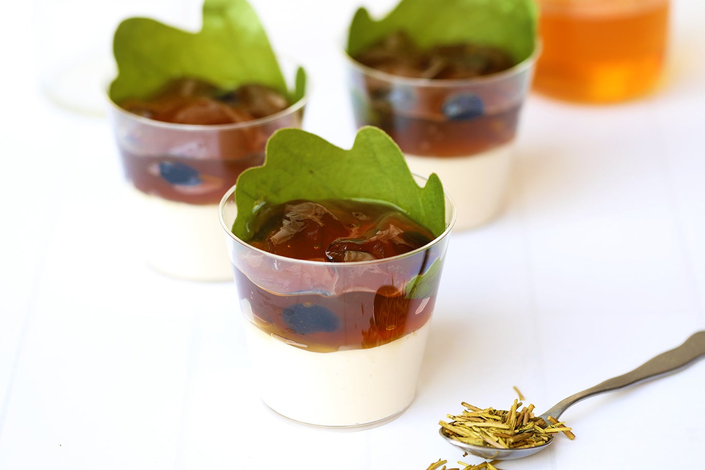 ・鍋に”献上加賀棒茶”の茶葉をどっさり入れてゆっくりと丁寧に煮出して作った加賀棒茶のゼリーと、パンナコッタを合わせました。