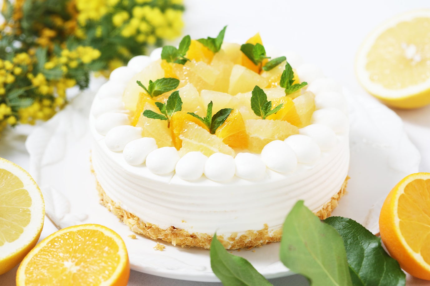 オレンジとホワイトグレープフルーツを使用し、みずみずしくフレッシュな味わいをお楽しみいただける季節のショートケーキです。ふわふわのスポンジでレモンカードとカスタードを合わせたクリームをサンドし、初夏にぴったりの爽やかな味わいに仕上げました。