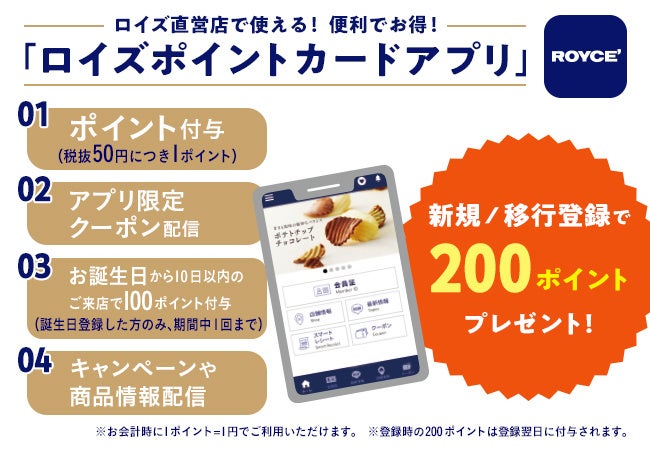 北海道内にあるロイズ直営店で使える「ロイズポイントカードアプリ」の会員を募集中です。直営店でのお買い物が対象のポイント付与や、アプリ会員限定クーポンの配信など、便利でお得なアプリになっています。ぜひダウンロードのうえ、直営店でのお買い物をお楽しみください。