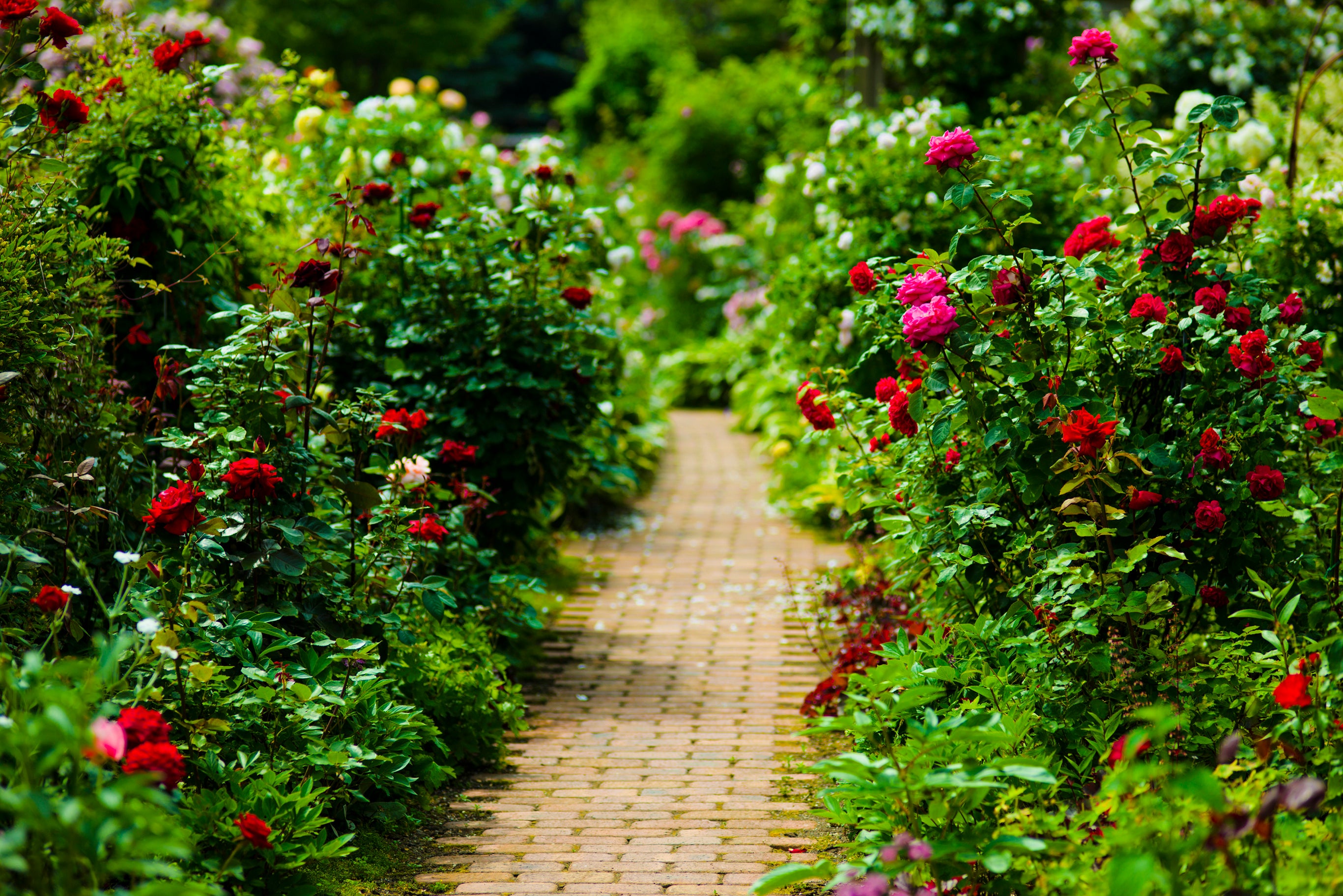 色とりどりの花々や色濃く輝きを増す木々のグリーン。